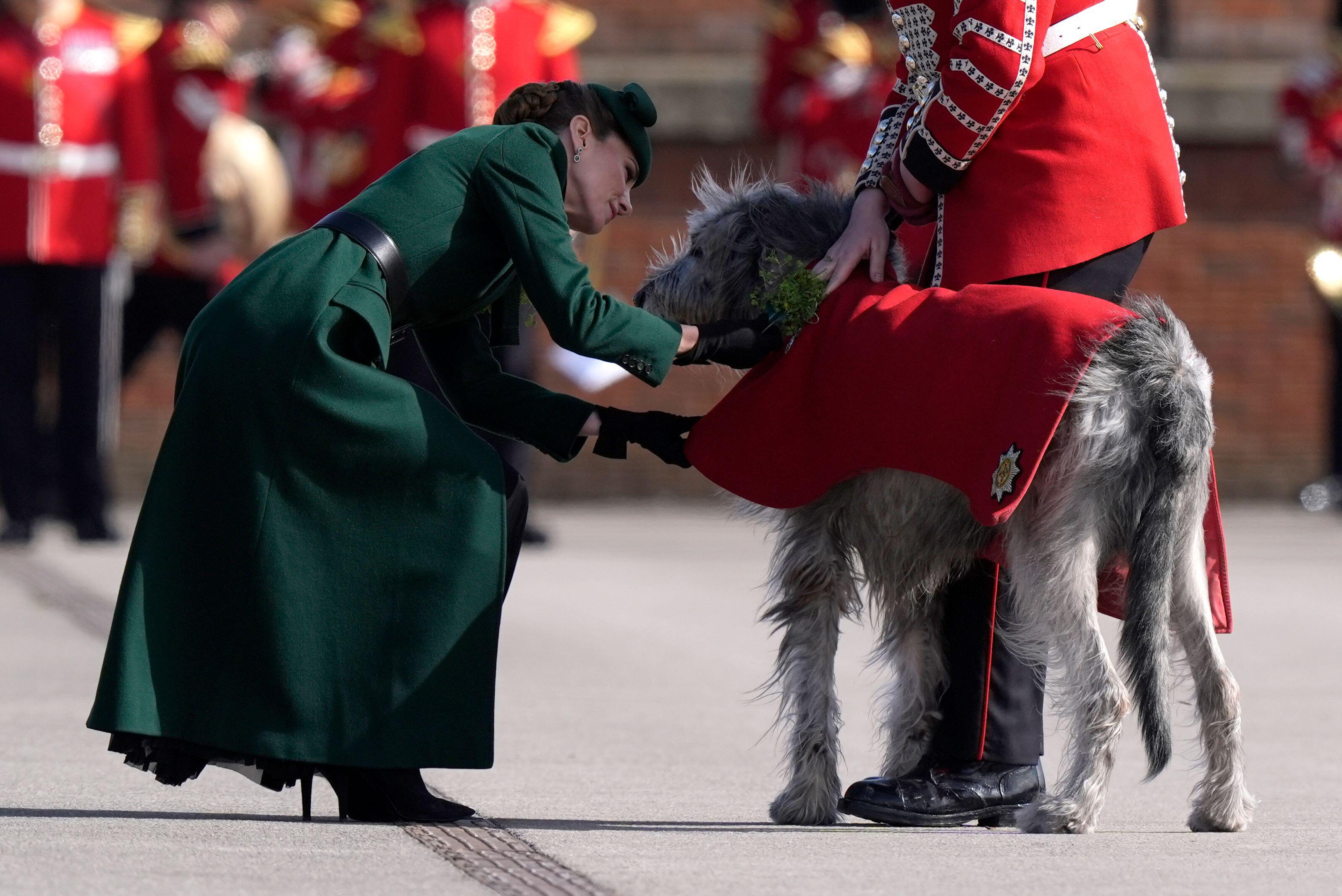 Во время парада Кейт традиционно вручала гвардейцам веточки трилистника и общалась с публикой. Особенно трогательным стал момент, когда маленькая девочка подарила Кейт букет цветов — будущая королева приняла его с теплой улыбкой. Не обошлось и без встречи с главным талисманом Ирландской гвардии — ирландским волкодавом Турлоу Мором, который в этот раз позировал семнадцатым по счету. Кадры с этой встречи уже разлетелись по соцсетям: собака выглядела не менее гордо и торжественно, чем сами гвардейцы 🥰