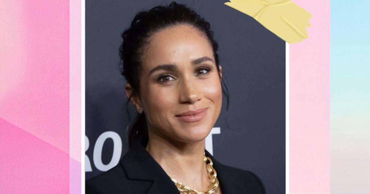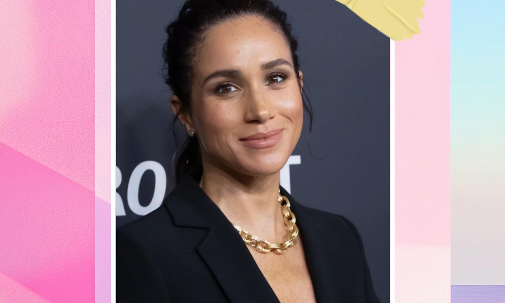 Меган дополнила костюм классическими черными лодочками на каблуке и лаконичным сатиновым клатчем, мягко отражающим свет. На шее — крупное золотое ожерелье со звеньями, акцент, который придал образу вечернее звучание.