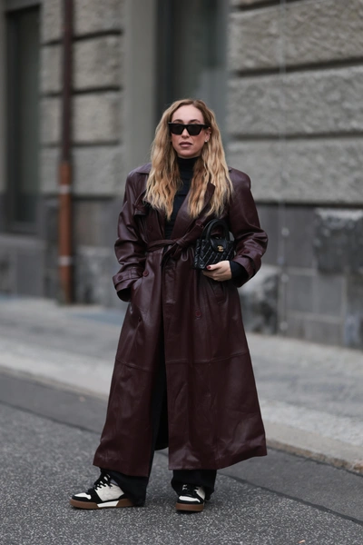Вишневый кожаный тренч + прямые джинсы + кроссовки