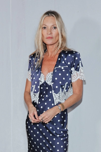 Мосс сменила привычный рок-н-ролльный стиль на нечто более изысканное. На ней была шелковая укороченная блузка и платье-комбинация из темно-синего атласа в белый горошек. Элегантный, почти чопорный ансамбль с мягкой драпировкой, пуговицами на лифе и кружевной отделкой на подоле — казалось бы, такой наряд скорее примерила бы с Кейт Миддлтон, чем главная бунтарка мира моды. Однако не стоит спешить с выводами! 😁