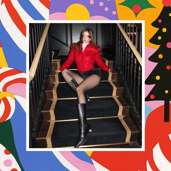 Сверху Барбара выбрала фактурный жакет насыщенного брусничного цвета. Приталенный силуэт и небольшие рукава-фонарики добавляют образу ретро-настроение и подчеркивают талию. Под жакетом — молочная водолазка, которая смягчает насыщенный оттенок и делает образ более зимним. Контраст плотного верха и легких шорт создает нужную динамику и не дает комплекту выглядеть тяжелым.