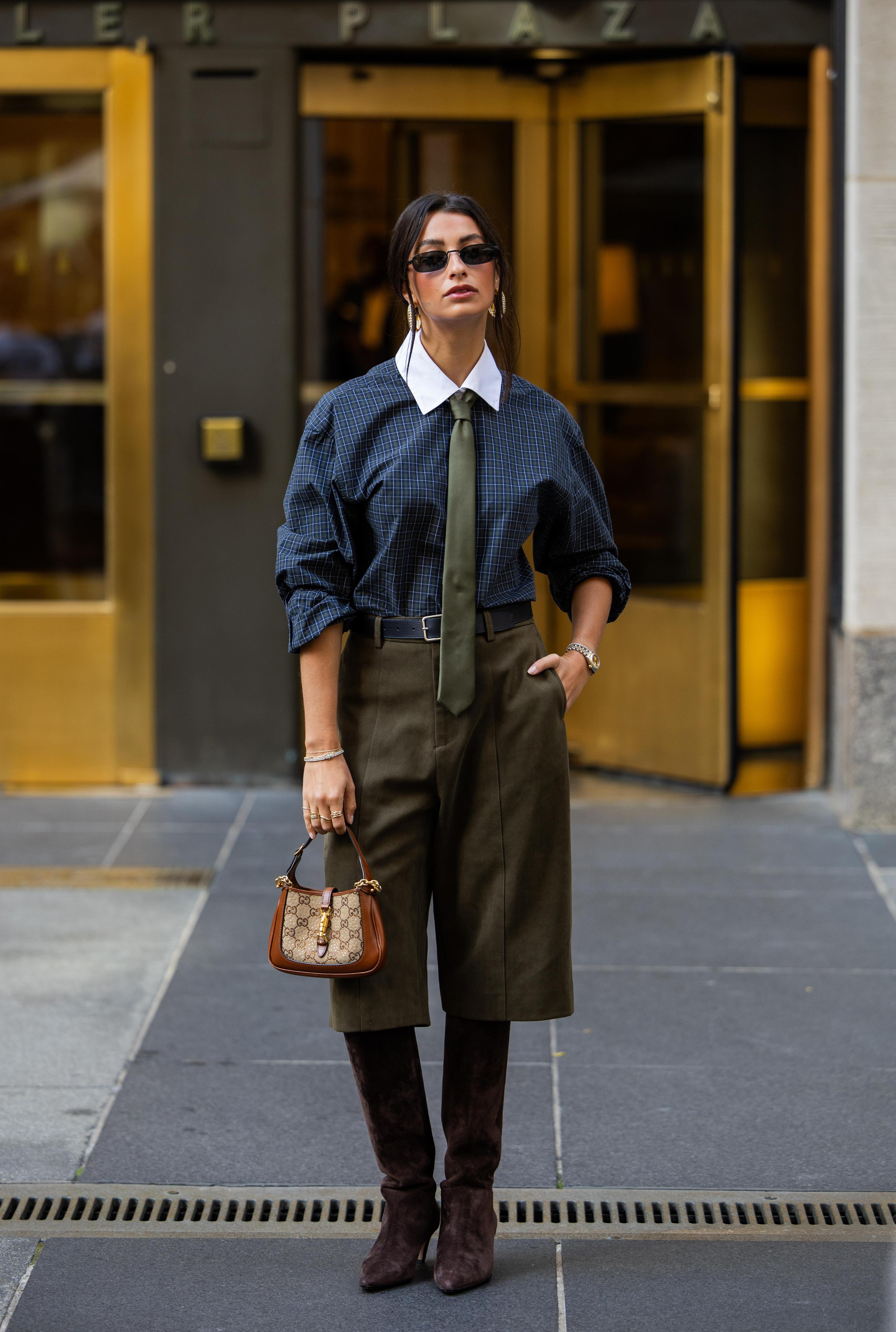 Этот прием выглядит неожиданно и свежо. Когда верх сапог скрывается под шортами, создается эффект цельной линии и смелого силуэта. Образ становится одновременно графичным и женственным. В таком сочетании особенно хорошо смотрятся плотные ткани — твид, шерсть, кожа. Добавь структурированную рубашку или жакет — и у тебя готов наряд для модной выставки или ужина.