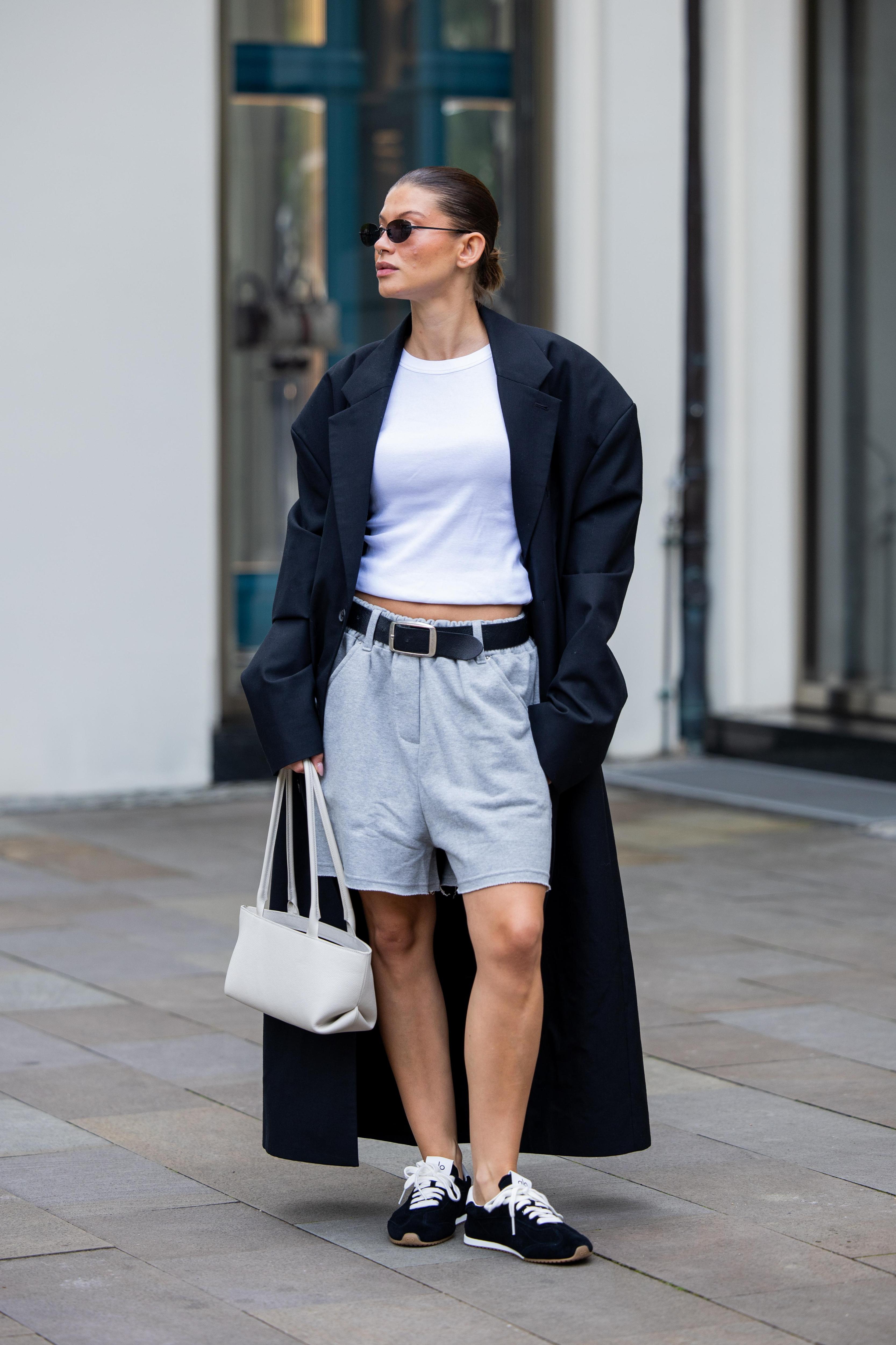 Максимальная практичность встречается с элегантностью. Длинное пальто или плащ в паре с бермудами создают вытянутый силуэт и делают образ визуально сложнее. Секрет здесь в пропорциях: короткий низ и удлиненный верх балансируют друг друга, а простая футболка или водолазка добавляют необходимую базу. Кроссовки или ботинки завершат ансамбль, сохраняя его комфортным на целый день.