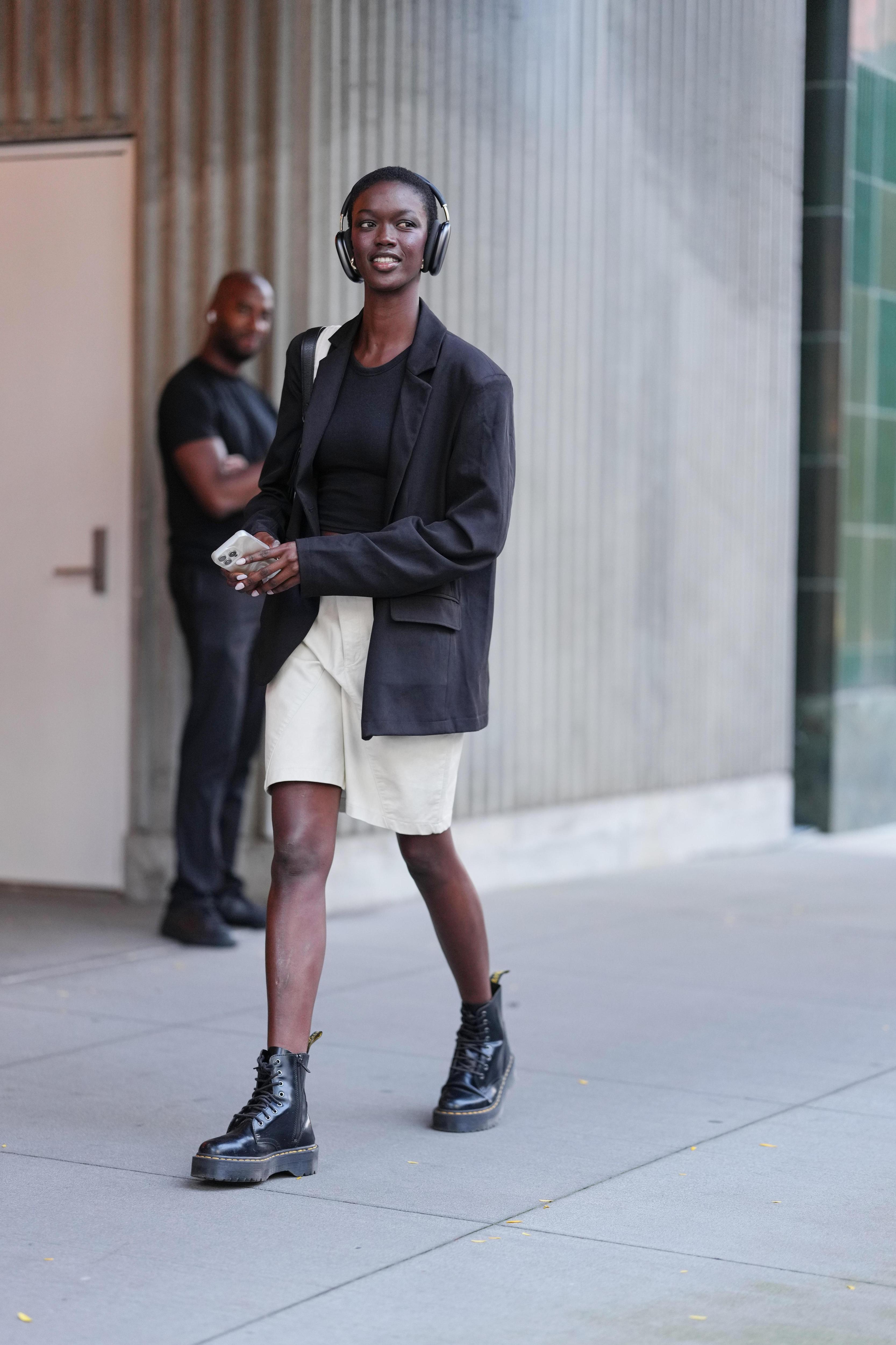 Если хочется немного рок-шика, этот вариант — находка. Объемный жакет добавляет расслабленности, а массивные ботинки подчеркивают характер. Это тот случай, когда шорты становятся частью смелого городского образа: чуть мужского по настроению, но при этом очень женственного за счет игры форм.