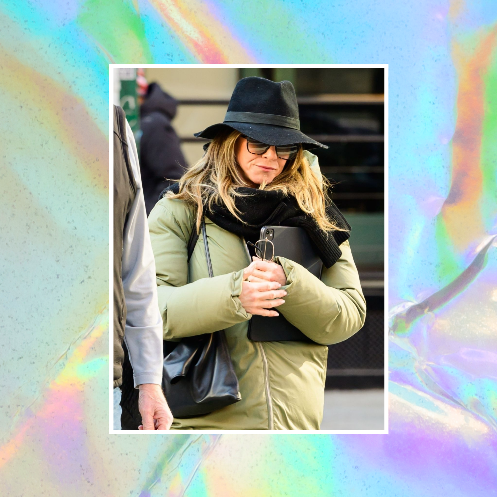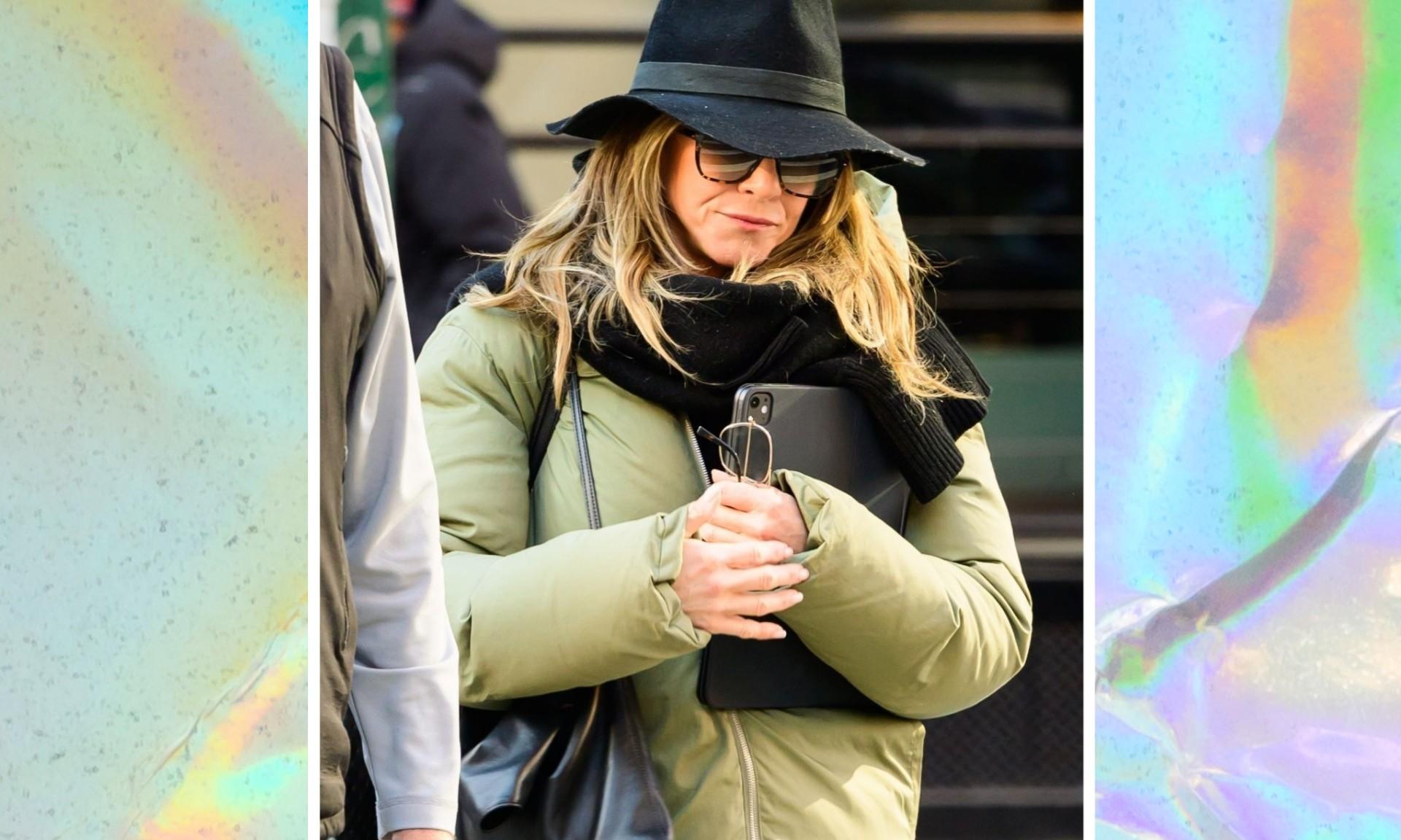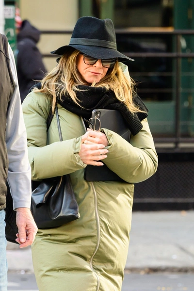 Важно, что шляпа здесь не существует отдельно от остального наряда. Энистон опустила капюшон куртки на спину, позволив головному убору стать главным акцентом, и дополнила его крупными солнцезащитными очками. Вместе они создают ощущение закрытости и приватности — особенно уместное для зимней прогулки звезды в большом городе.