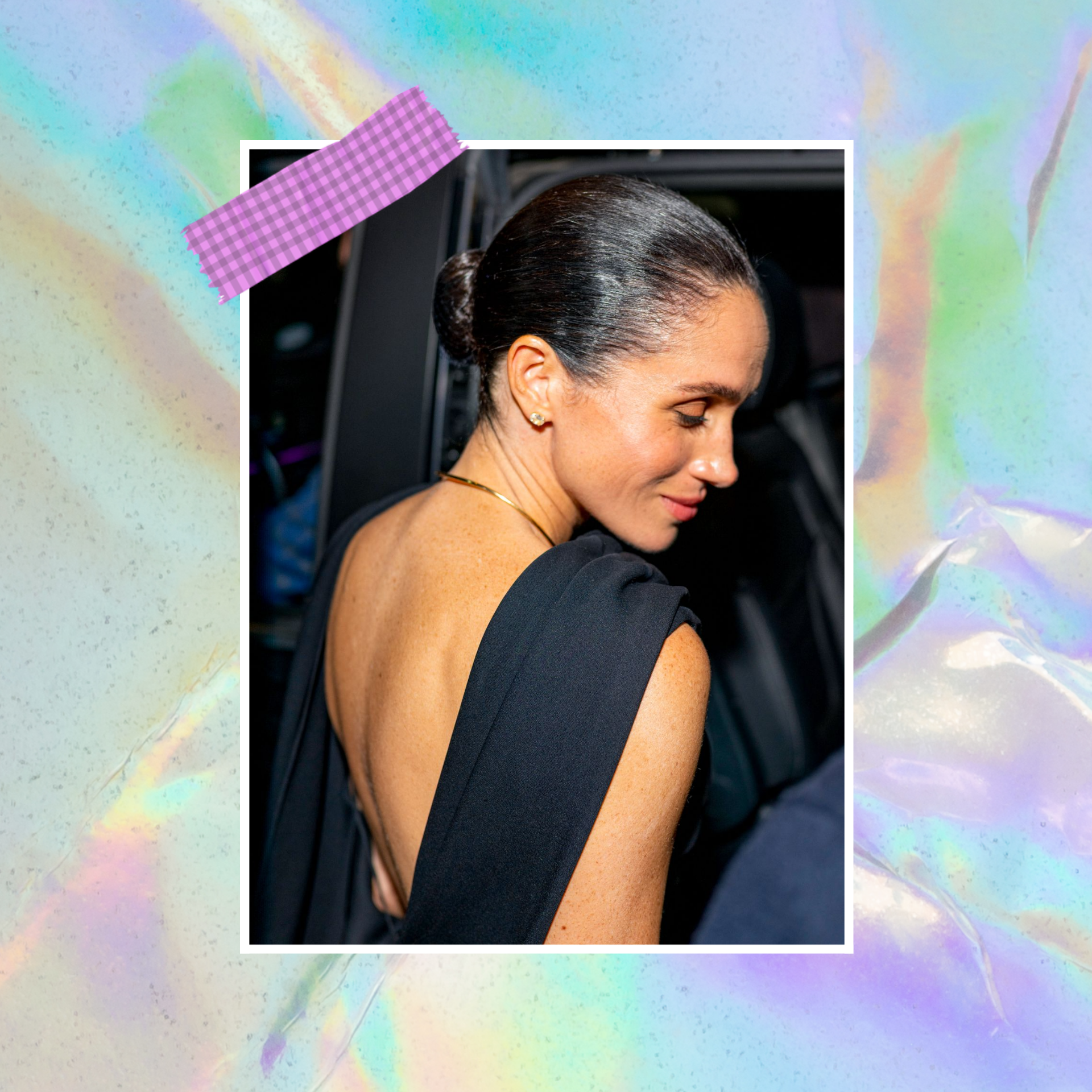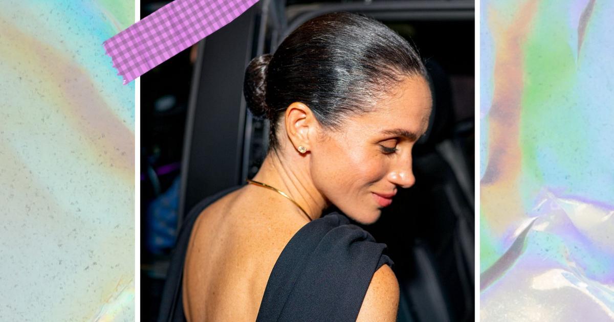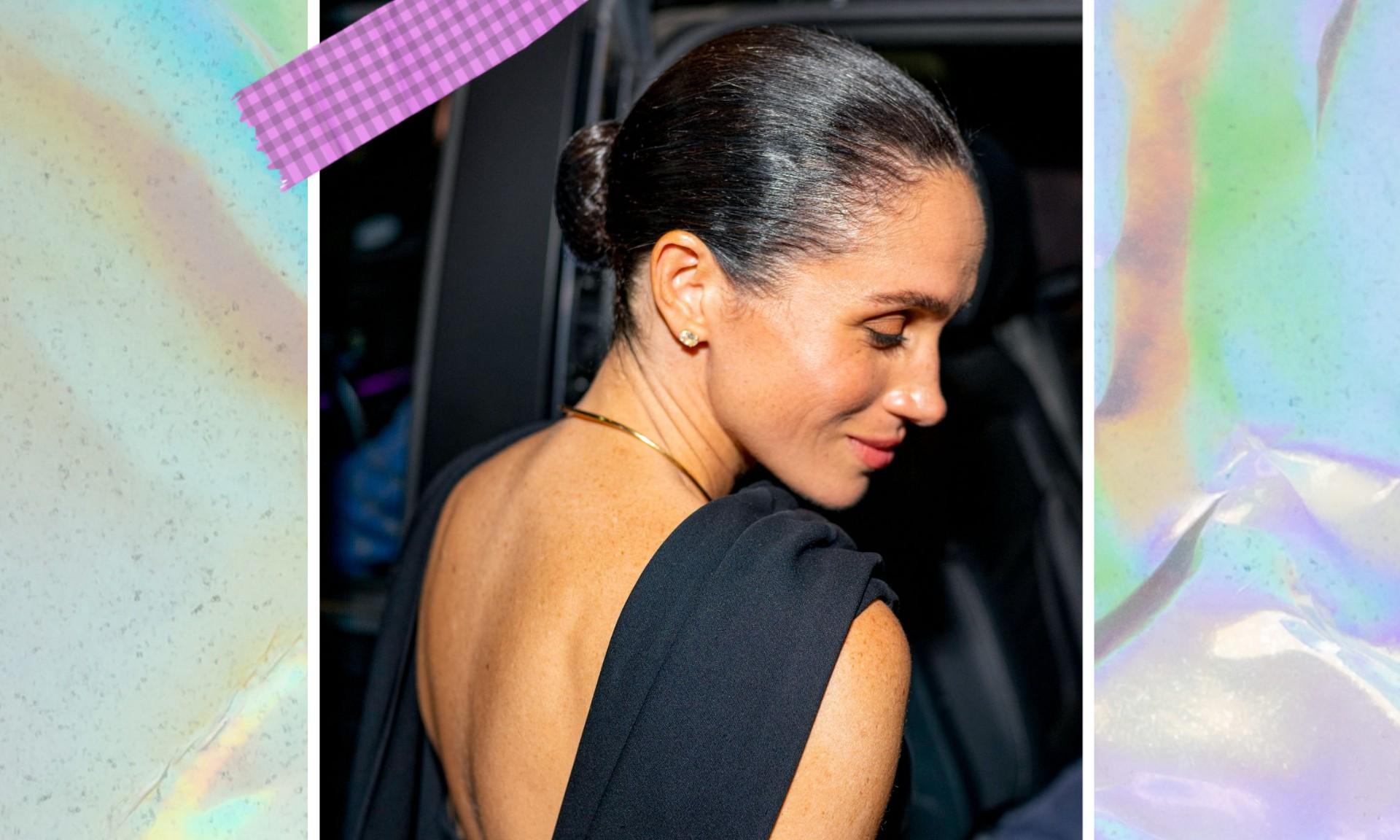 Меган дополнила наряд остроносыми черными атласными туфлями Balenciaga и миниатюрным шелковым клатчем. Из украшений — только серьги-подвески с бриллиантами и браслет Cartier Love. Никаких лишних деталей. Волосы собраны в аккуратный пучок, макияж мягкий, с акцентом на сияющую кожу. Элегантно, утонченно и роскошно.