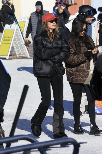 Хейли — верная поклонница минимализма. Ее выбор — аккуратный короткий пуховик без капюшона, с горизонтальной строчкой и четким силуэтом. Без лишнего объема, но достаточно теплый, чтобы выдержать любую поездку по городу. Все в духе ее стиля: лаконичность, сдержанность и, конечно, снова тотал-блэк. Этот пуховик легко представить и с джинсами, и с трикотажным костюмом, и даже с длинной юбкой — универсальность в чистом виде.