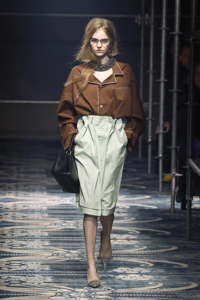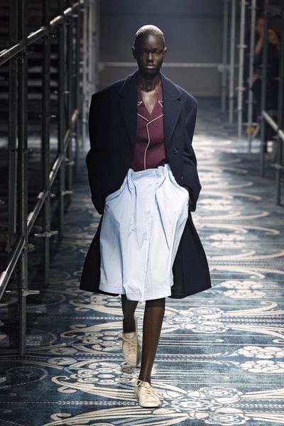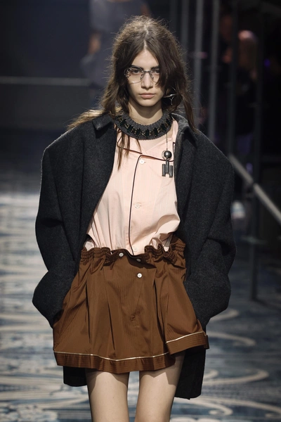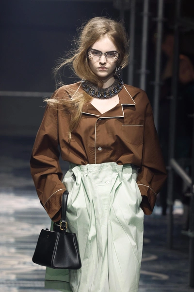 Главным апологетом пайпинга в этом сезоне становится Prada. В осенне-зимней коллекции 2025 года бренд превратил окантовку в полноценный архитектурный элемент классического кроя. Контрастная отделка проходила вдоль воротников, манжет и карманов, подчеркивая четкие линии рубашек, и мягко очерчивала края брюк и юбок. Сочетания шоколадного и сливочного, коричневого и нежно-розового создавали эффект графичного минимализма, в котором каждая строчка выглядела осмысленно.