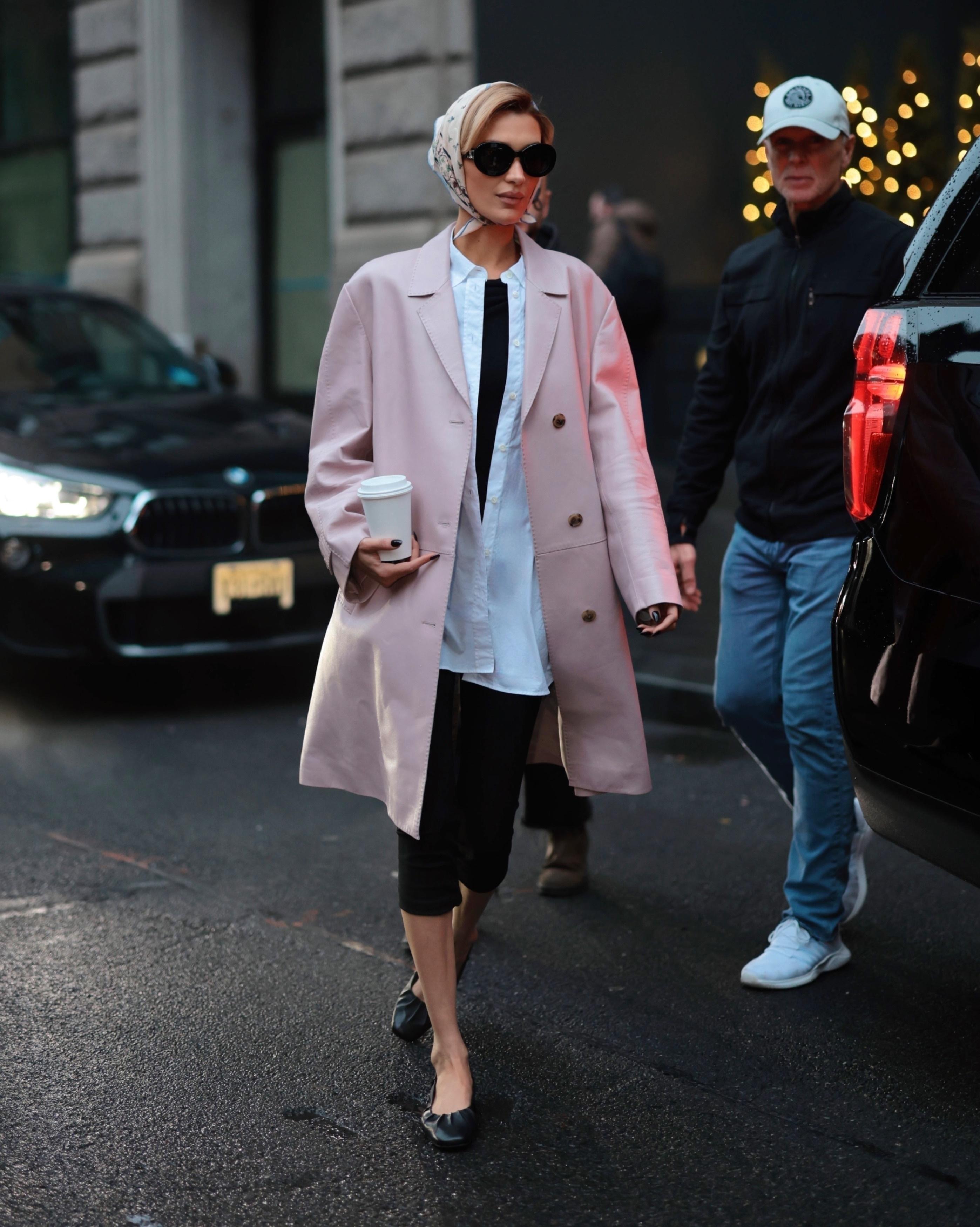 Крупные солнцезащитные очки, шелковый платок, завязанный аккуратным узлом под подбородком, балетки и капри — если бы не съемочная команда и современные автомобили на заднем плане, легко поверить, что эти кадра были сделаны где-нибудь в середине XX века. Снимая новый проект в Нью-Йорке, Белла появилась у отеля Pendry в образе, который отсылает к героиням фильмов Хичкока: напряженная элегантность, сдержанный шик и ни одной лишней детали.