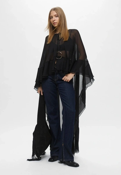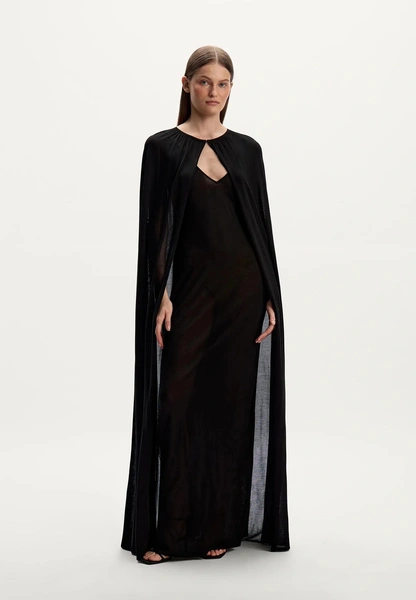 Накидка оказалась редким примером вещи, которая одновременно выглядит эффектно и решает практическую задачу. Она добавляет образу объема, движения и драматичности, но при этом легко вписывается в повседневный гардероб. В ней есть ощущение праздника, даже если под ней — самый простой комплект.