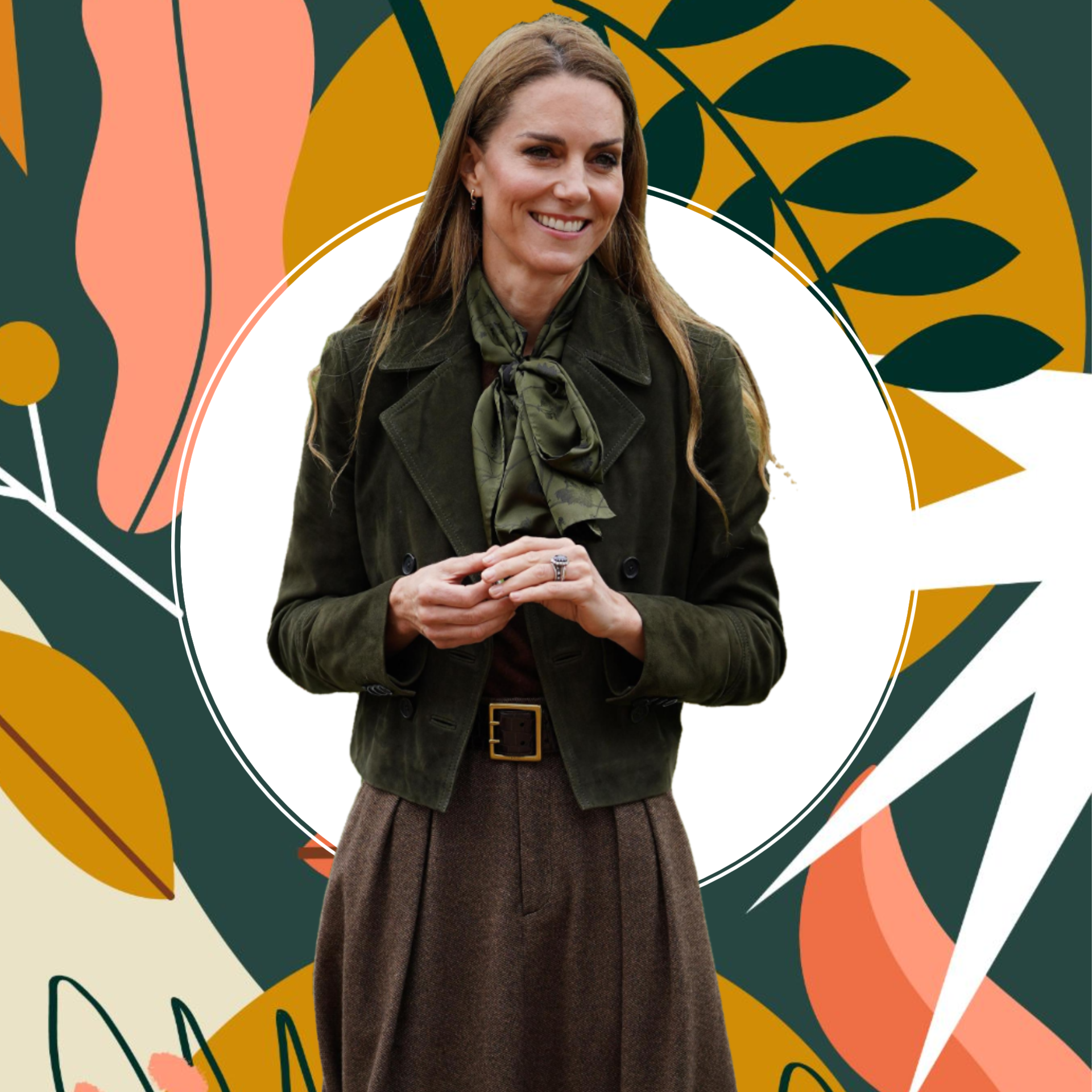 Не обошлось и без любимых аксессуаров Кейт — на шее она завязала узорчатый платок из темно-зеленого шелка, найденный в Sudbury Silk Mills Shop. Этот небольшой магазин в графстве Саффолк давно стал частью ее модной истории, ведь не раз именно его изделия появлялись в гардеробе принцессы во время поездок по стране.
