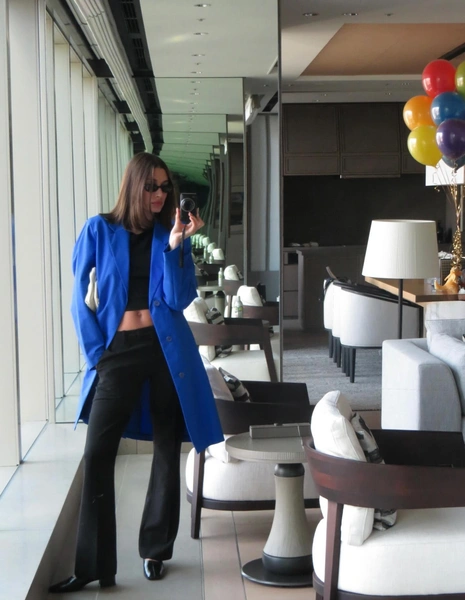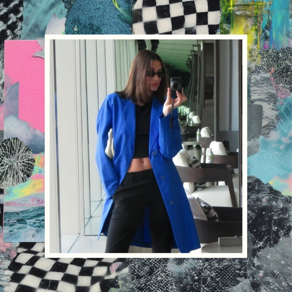 Однако самое сильное впечатление произвел снимок, прибереженный напоследок. На нем Хейли запечатлела себя в пальто невероятного электрического синего цвета. Эта верхняя одежда оказалась настоящей находкой для ценителей высокой моды: вещь из коллекции Jil Sander сезона весна-лето 2011 года под руководством Рафа Симонса. Вещь с историей, созданная в начале десятых, мгновенно притягивала взгляд на фоне сдержанной черно-белой гаммы остального антуража.