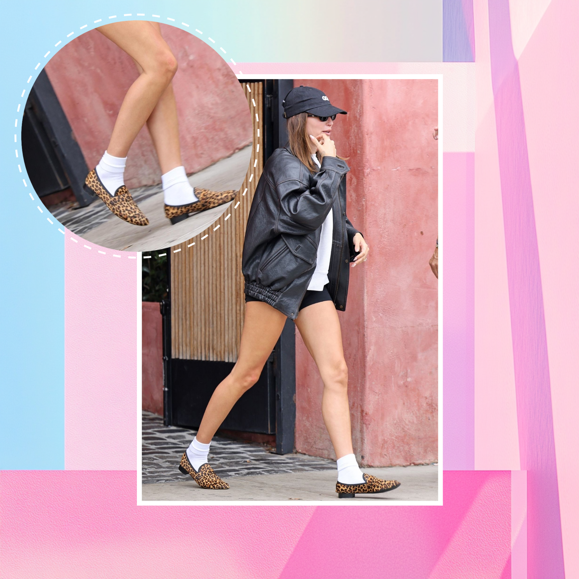 Короткие черные велосипедные шорты, белая футболка свободного кроя, сверху — объемная кожаная куртка с легким налетом винтажности. Все это сочетание работает как фон, на котором леопардовые лоферы смотрятся особенно ярко. Белые носки, надетые с обувью, придают наряду неожиданную дерзость и сразу отсылают к стилю streetwear, которому Хейли остается верна.