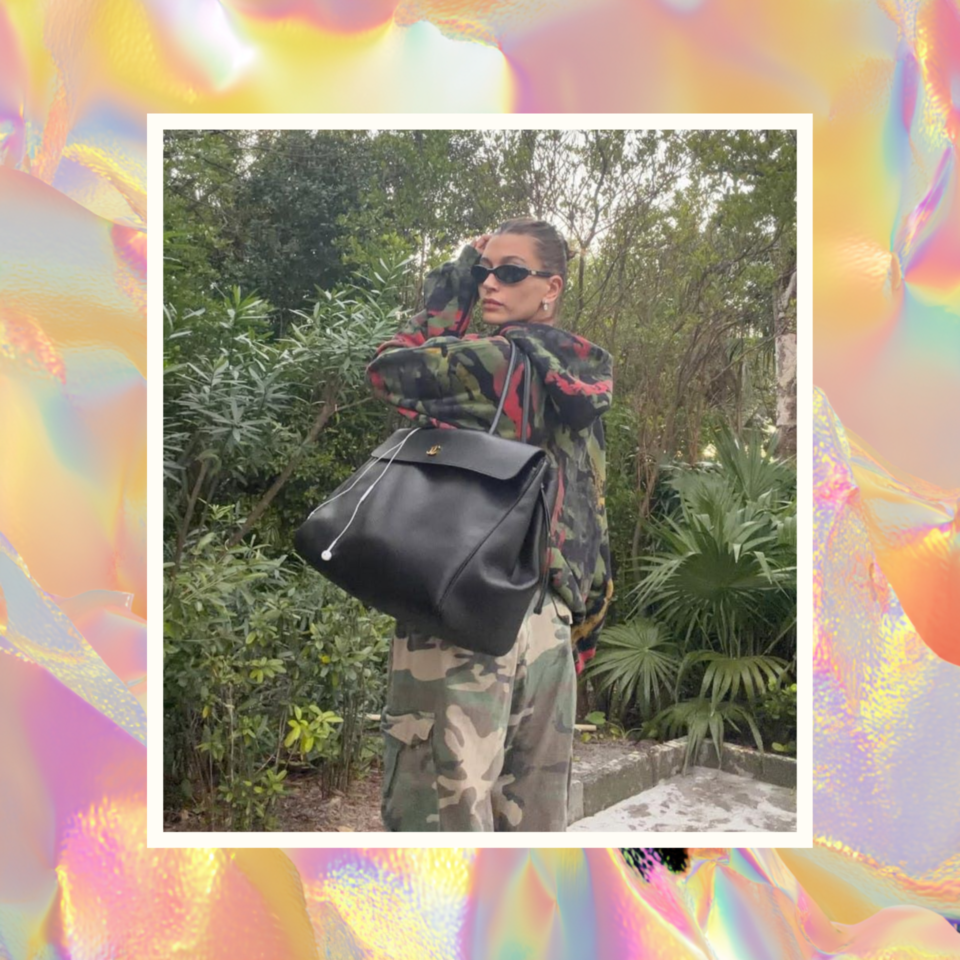 От привычных для Chanel женственных ассоциаций Хейли ушла намеренно. Новый аксессуар она сочетала с мешковатым свитшотом и брюками карго с контрастным камуфляжным узором. Такой контекст подчеркивает утилитарный характер сумки и делает ее частью повседневного гардероба, а не дополнением к классическому жакету или платью.
