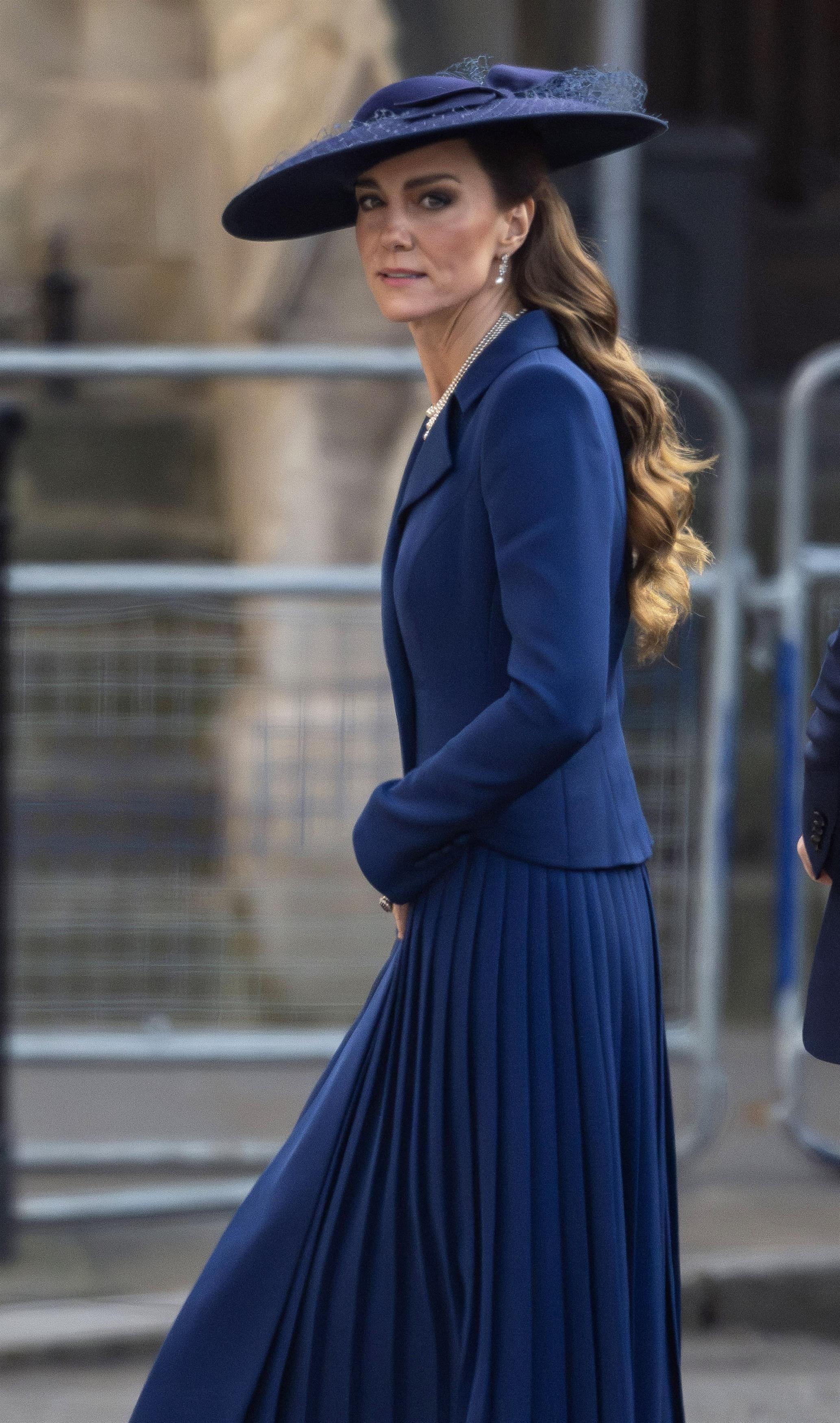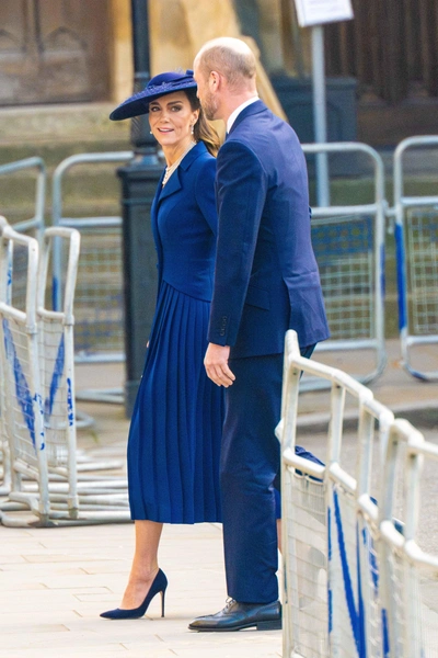 Но вернемся к главному — к моде. Кейт выбрала для этого выхода тотальный образ в кобальтовом синем, который сейчас считается одним из главных оттенков сезона. На ней было приталенное платье-пальто от Catherine Walker с длинными рукавами, острыми плечами и заостренным воротником. Складки, идущие от лифа до самого низа, создавали иллюзию отдельной юбки и добавляли силуэту воздушности. В тон пальто — широкополая шляпа с изящным бантом и сетчатой вставкой, которая придавала образу нотку загадочности.