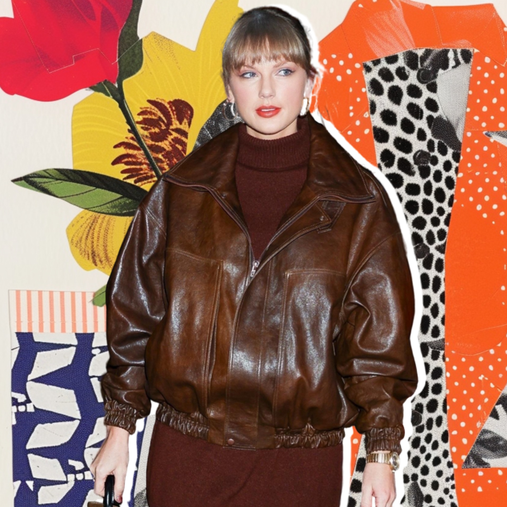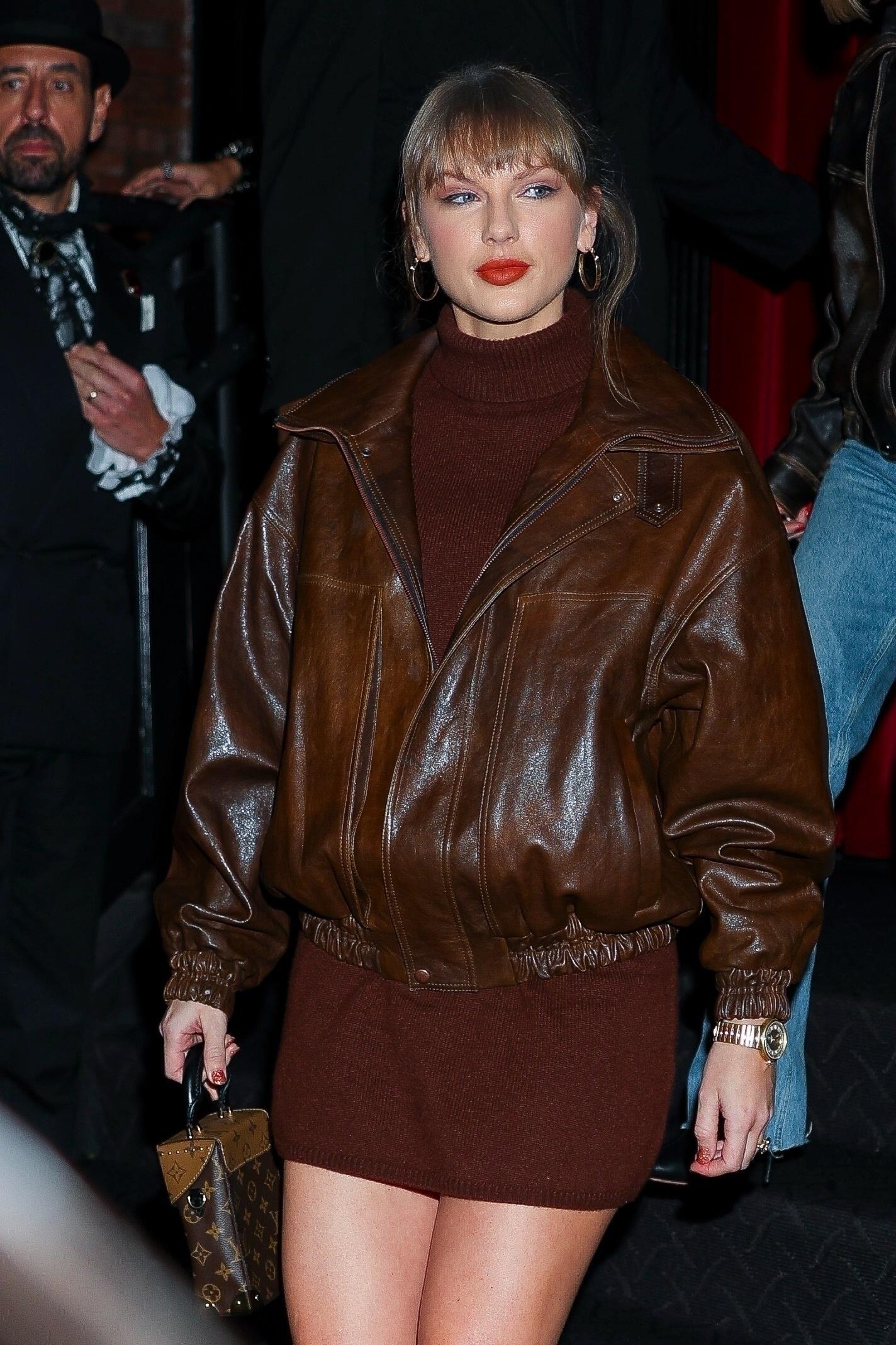 Несмотря на промозглый дождь, Свифт выбрала короткое платье-свитер карамельно-коричневого оттенка с высоким воротом. Мягкий трикотаж подчеркивал фигуру, но не выглядел вызывающе — напротив, создавал тот самый комфортный образ, который хочется повторить зимой. Поверх певица надела кожаную куртку оверсайз в тон — прием, который добавил объема и сделал образ более расслабленным.