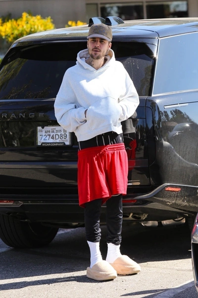 И снова джинсы, ломающие законы физики! Точнее, красные шорты. Только в этот раз Джастин надел под них лосины, так что белья мы не увидели. Поверх лосин — белые носки и любимые тапочки. Образ получился слоеным, как пирог, и таким же нелегким для восприятия 😵💫