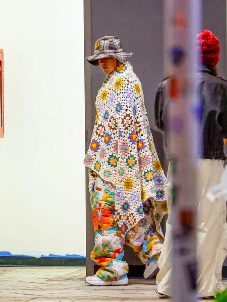 У одного из ресторанов его засняли в сумасшедшем ярком пледе, выполненном в технике кроше, в традиционном лоскутном исполнении. Снизу на нем — не менее безумные стеганые брюки с принтом в кислотных оттенках. А на голове для пущего эффекта — клетчатая панама 🙃