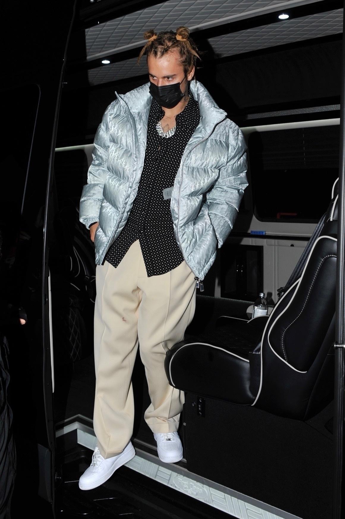 Сюда Джастин заявился в образе, который запомнился даже не одеждой, а прической. Два игривых пучка на голове — а-ля рожки. Так что с бьюти-стороной, как ты видишь, певец тоже успел поэкспериментировать, и результат вышел, мягко говоря, неоднозначным.