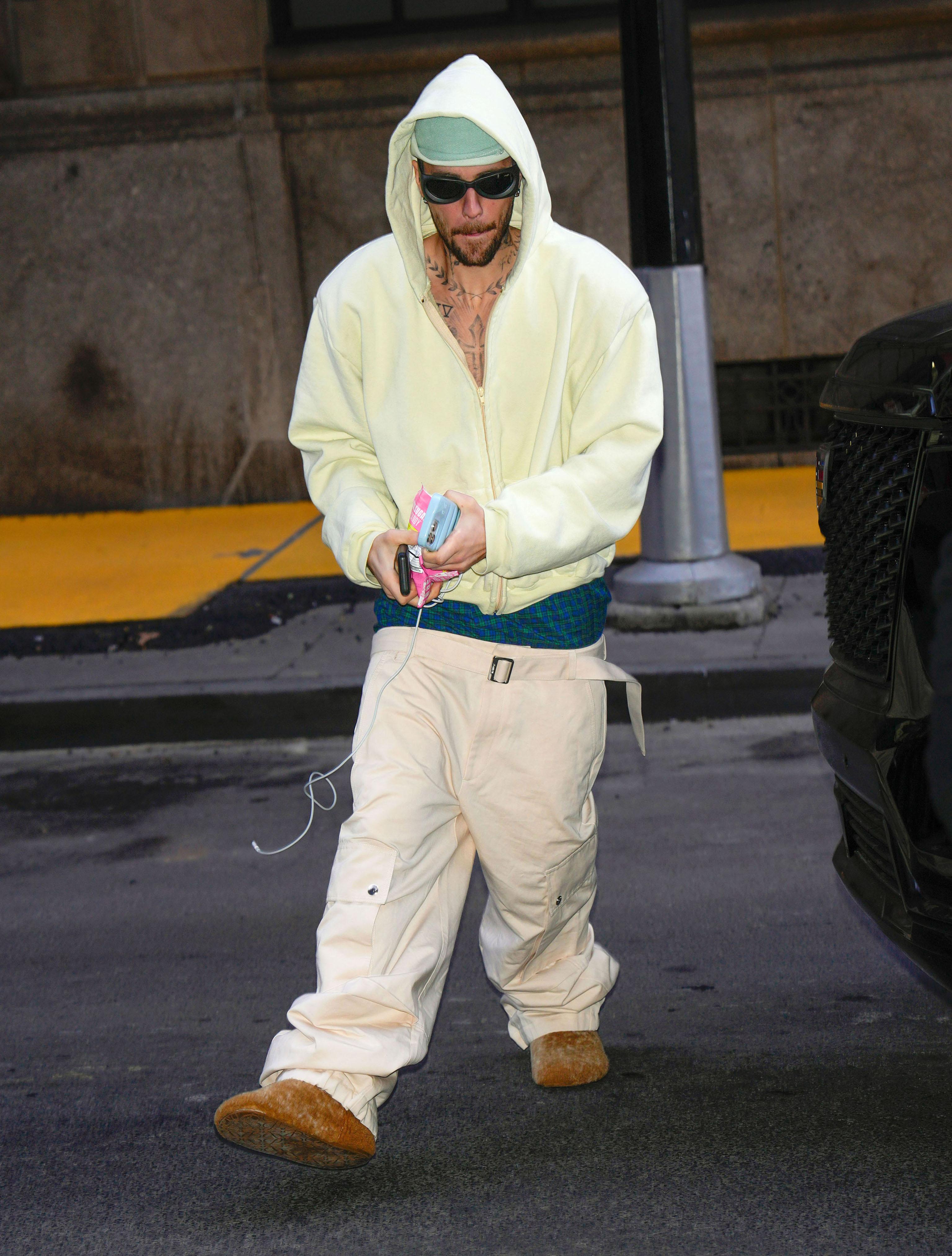 Здесь Джастин решил оторваться на многослойности. Надел худи, поверх него другую длинную толстовку, а сверху — еще одну! Вторая в итоге висела как платье. Джинсы, само собой, снова сидели ниже положенного и собирались объемной гармошкой у щиколоток.