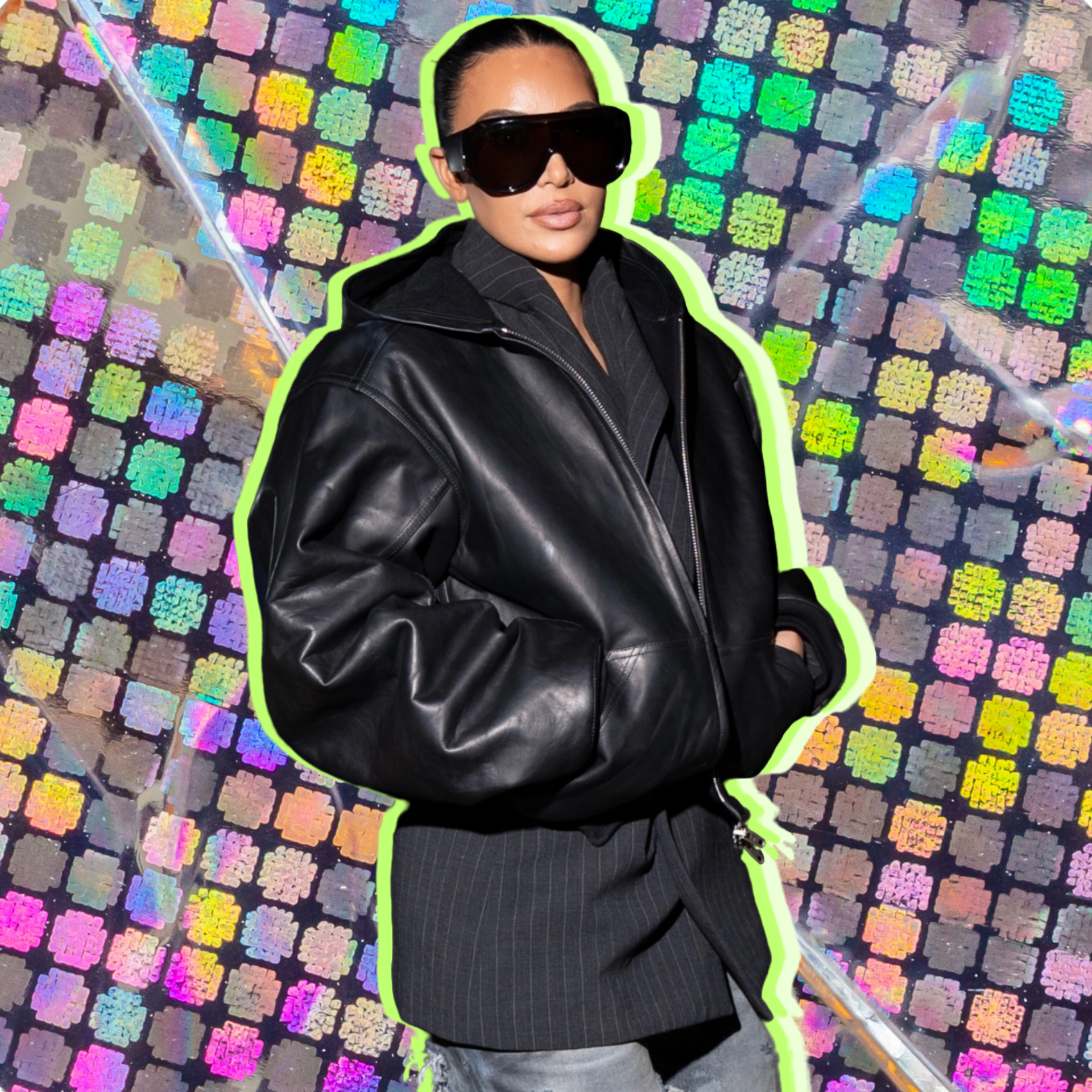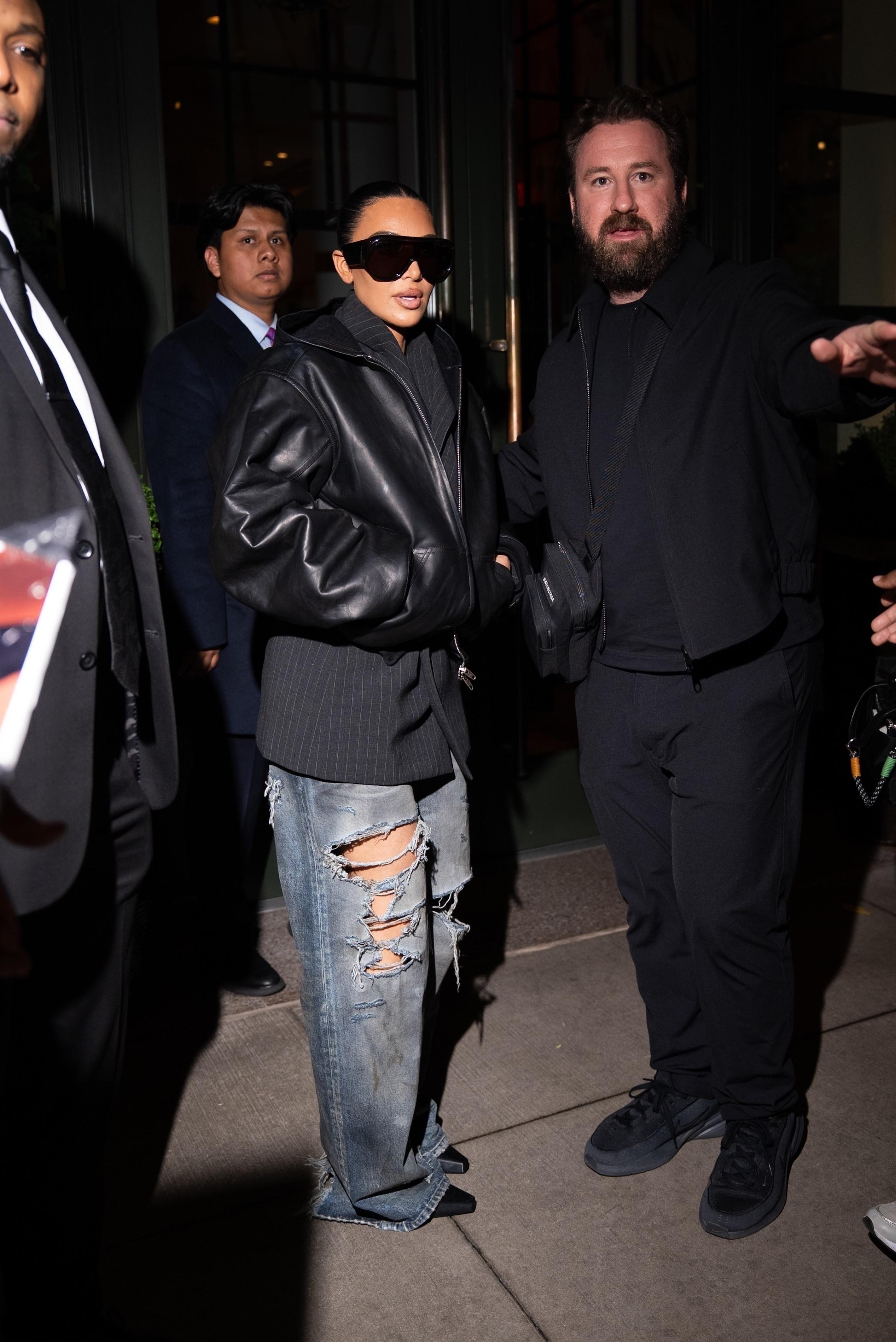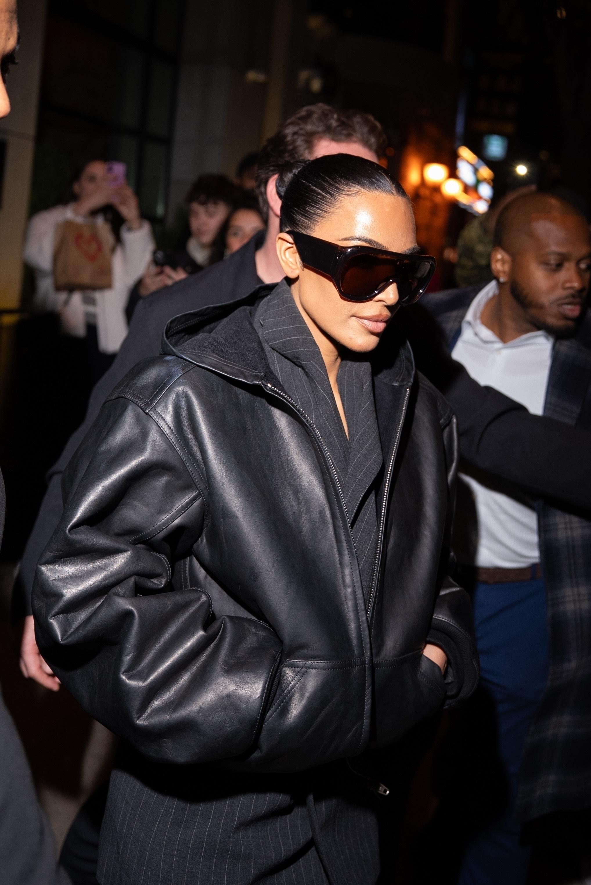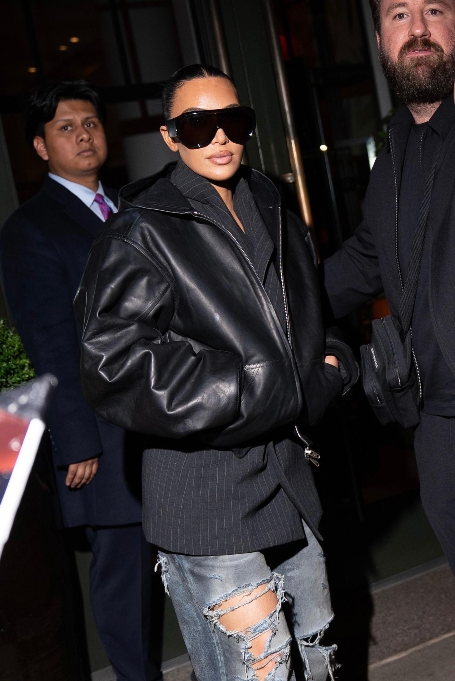 Кардашьян появилась у выхода из нью-йоркского отеля Whitby в угольно-сером жакете в тонкую полоску, напоминающем классический мужской блейзер. Поверх него — объемная кожаная куртка-бомбер, будто позаимствованная из гардероба байкера. Контраст длин и фактур выглядел намеренно дерзко: короткая куртка заканчивалась чуть ниже линии талии, открывая подол удлиненного жакета, который свободно ложился поверх джинсов.