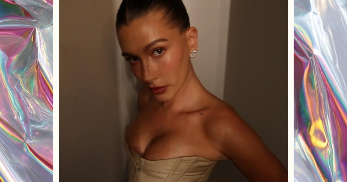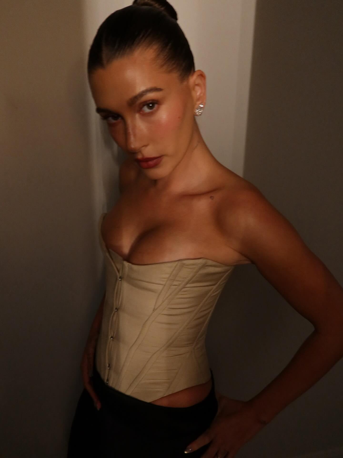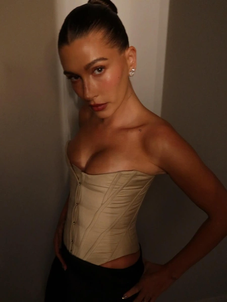 Для выхода Хейли выбрала нюдовый корсет, который на первый взгляд выглядит максимально базово. Без сложного декора, вышивки и броских деталей — чистая форма и плотная посадка. Корсет плотно облегал фигуру, подчеркивая талию и создавая выразительный акцент на линии груди. За счет кроя образ получился эффектным, но не перегруженным: здесь нет ощущения нарочитости, только уверенная работа с силуэтом.