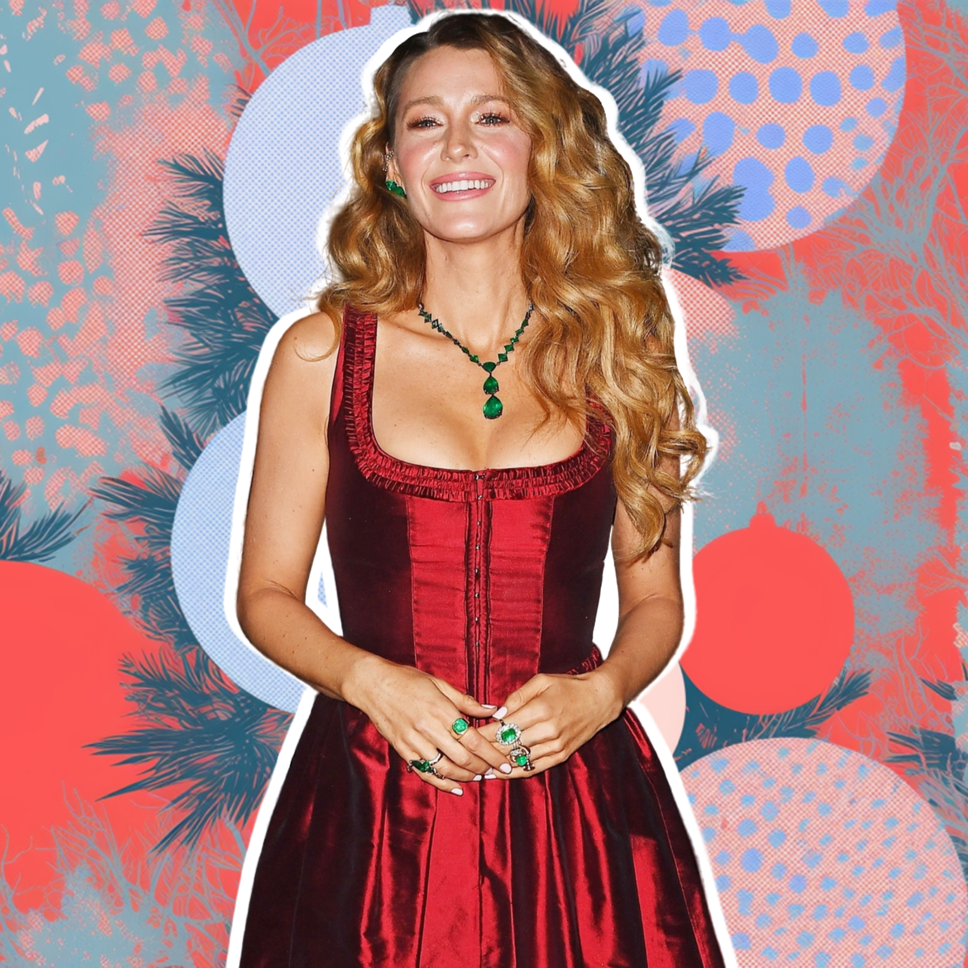 Цветовая палитра образа отсылает к классическим рождественским оттенкам — красному и зеленому. Лайвли добавила к своему алому платью украшения с изумрудами от Лоррейн Шварц. Это не легкий намек, а полноценная россыпь драгоценных камней: множество крупных колец, заметные серьги и ожерелье внушительного размера с каплевидными зелеными вставками. Изумруды в таком сочетании не заглушают яркость платья, а наоборот, усиливают образ, добавляя глубины и создавая игру контрастов.