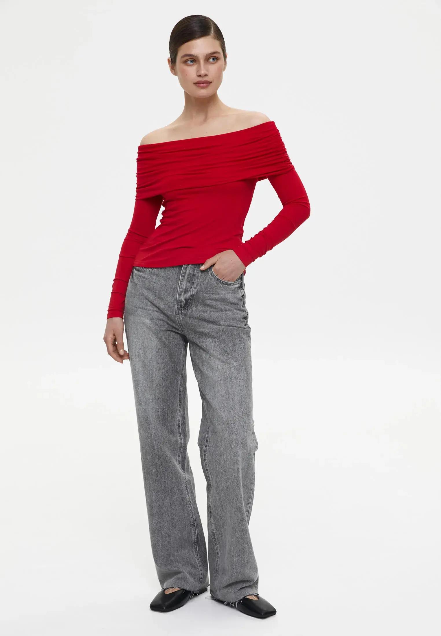 Красный лонгслив с открытыми плечами в таком прочтении — отличная альтернатива привычным свитерам и топам для зимы 2025/26. Он работает и в повседневных образах с джинсами, и в более нарядных сочетаниях, если добавить акцентный ремень, выразительную обувь или украшения. Пример Беллы Хадид наглядно показывает: эффектная вещь не обязательно должна быть сложной. Достаточно яркого цвета, удачного выреза и уверенности в себе 🥰