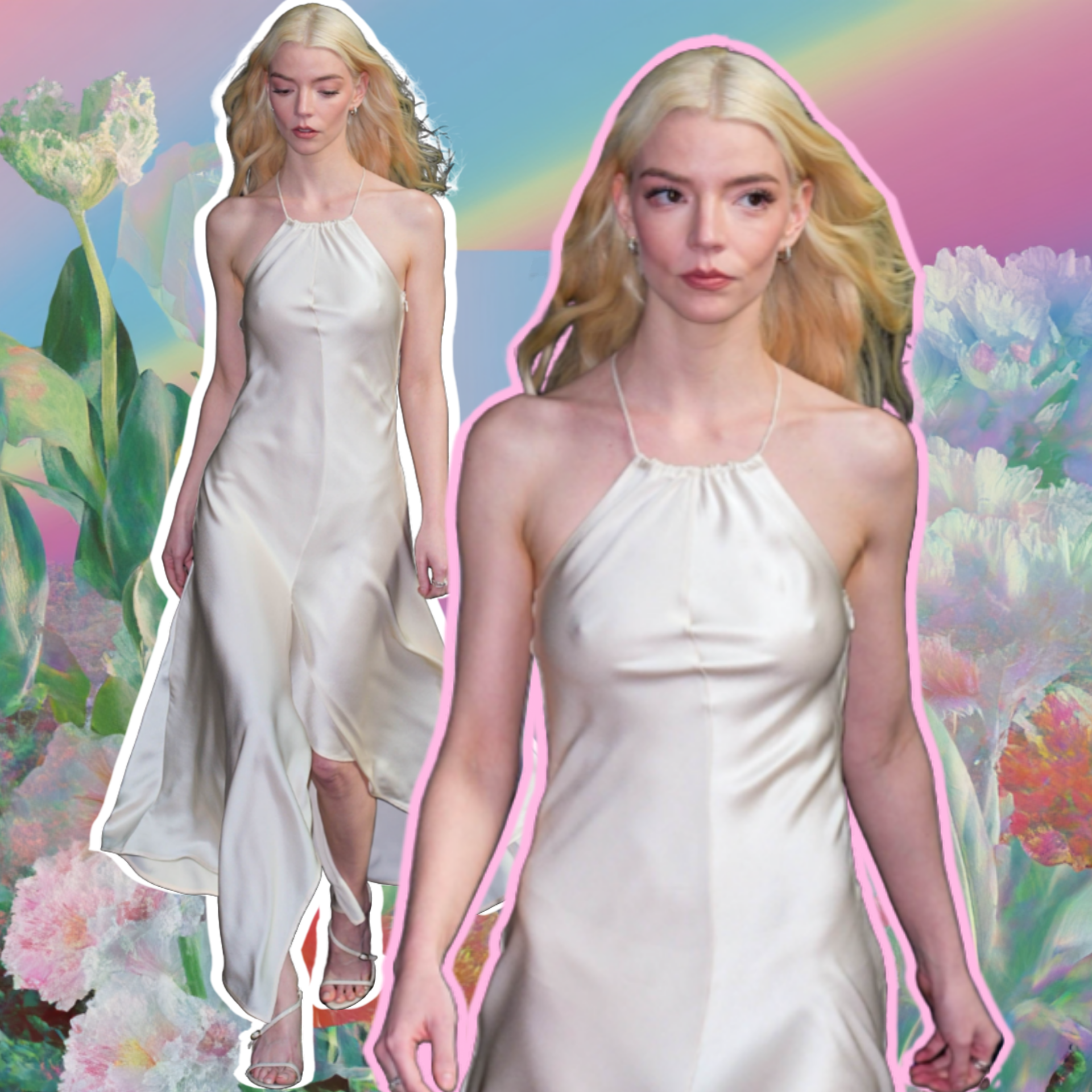 На ногах у Тейлор-Джой были босоножки с тонкими ремешками от Giuseppe Zanotti, которые практически не видны на ноге и не перетягивают внимание на себя. Длинные светлые волосы актриса оставила распущенными — слегка волнистые, они развевались на ветру и придавали женственности и непринужденности. Макияж Аня выбрала свежий и естественный: никаких ярких акцентов, только сияющая кожа и легкий румянец. Аксессуары также минимальны: пара колец на руках и аккуратные серьги-кольца в ушах.
