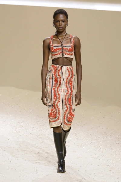 Кроп-топ с рисунком или орнаментом добавляет образу индивидуальности и характер. Hermès предложили модели с аккуратными, но заметными узорами, которые делают образ ярким, но не перегруженным. Такой топ идеально сочетается с однотонными элементами гардероба, создавая баланс между выразительностью и универсальностью.