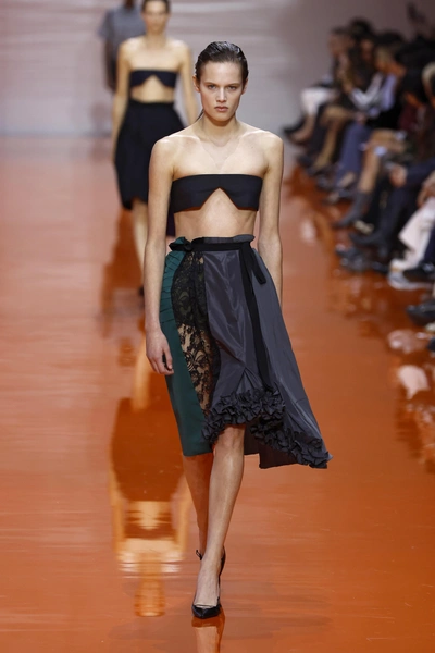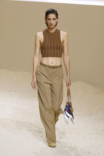 Замша — еще один материал, который неустанно возвращается в тренды. Hermès показали кроп-топ из мягкой замши, подходящий для более холодной погоды. Такой топ удобно носить с юбками, брюками и под жакеты. Он придает образу текстуру и глубину, делая его более сложным и интересным визуально.