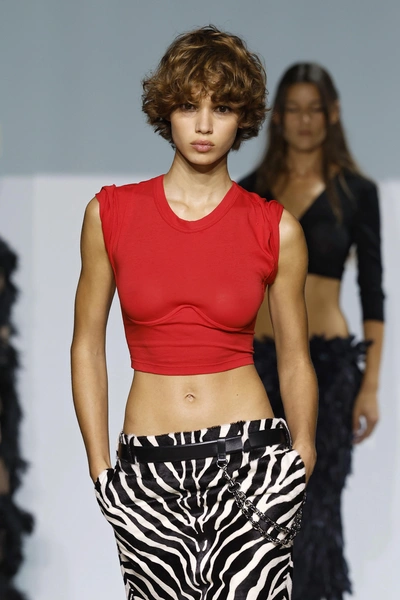 Красный цвет снова занимает центральное место в коллекциях весна-лето 2026. Топы насыщенного оттенка появились у многих дизайнеров, включая The Attico. Красный кроп-топ легко сочетать с базовыми вещами: джинсами, белыми брюками или черной юбкой. Он сразу привлекает внимание и становится акцентной деталью образа, добавляя уверенности и энергии.