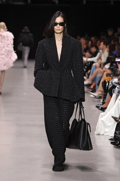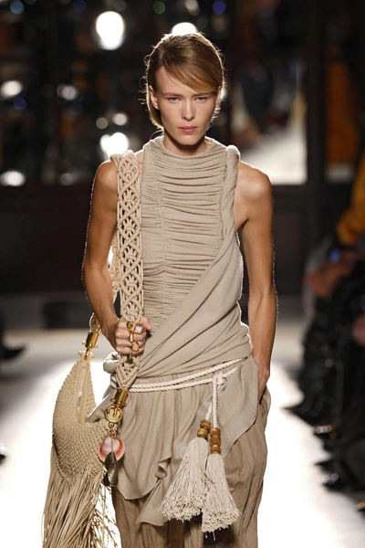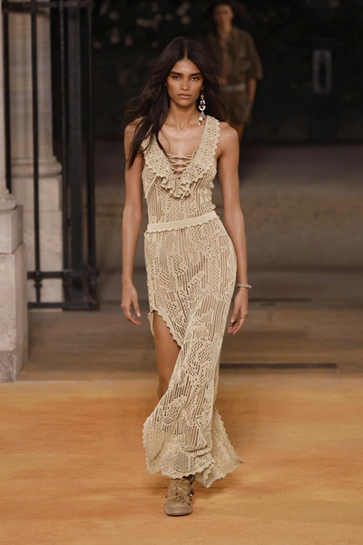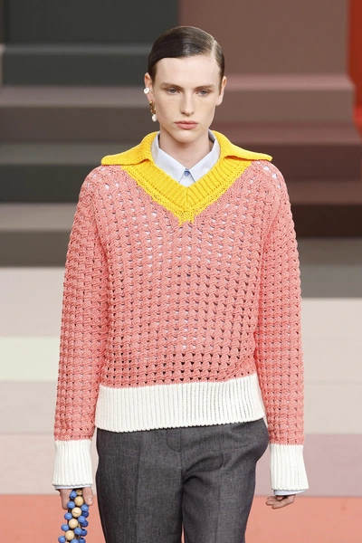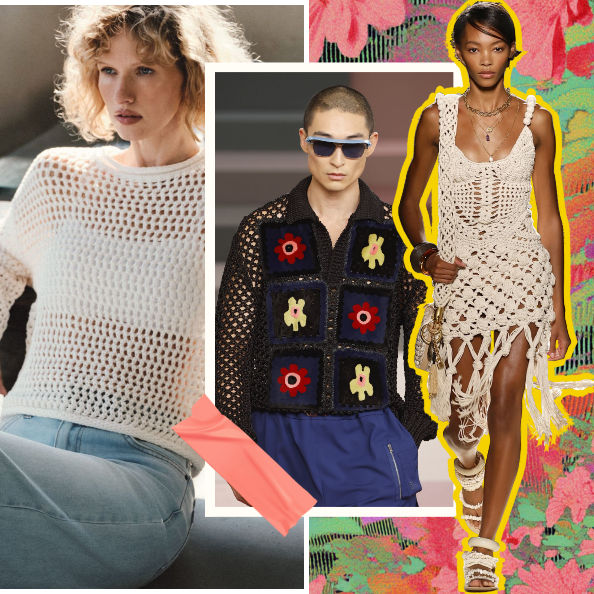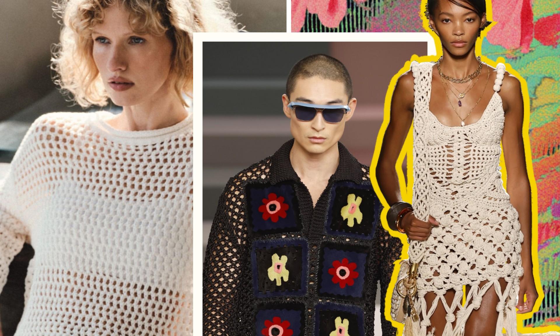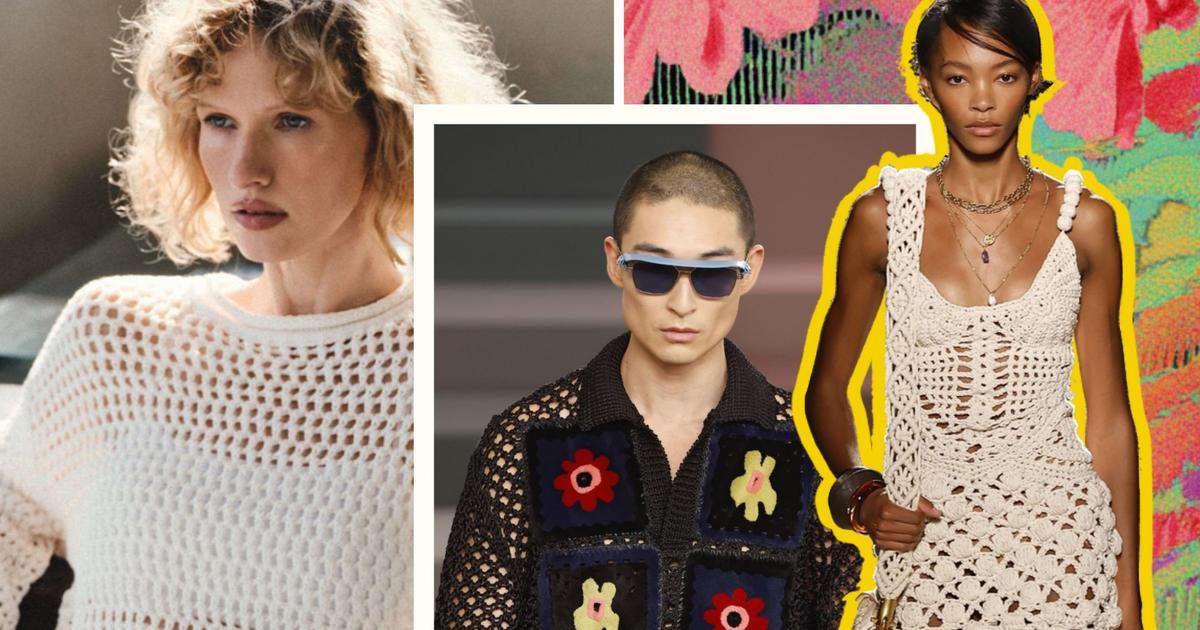 Вязаные изделия с крупной перфорацией по традиции возвращаются к нам весной и летом. От джемперов и платьев до целых брючных костюмов, связанных крючком, — можно начинать просить своих бабушек и мам уже сейчас браться за спицы (ну или самой: если ты умеешь орудовать крючком — тебе ой как повезло! 😁) Кстати, в почете теперь не столько характерные ажурные узоры, сколько простая сетка. Именно она создает тот самый эффект небрежной легкости, который так ценят дизайнеры и модницы.