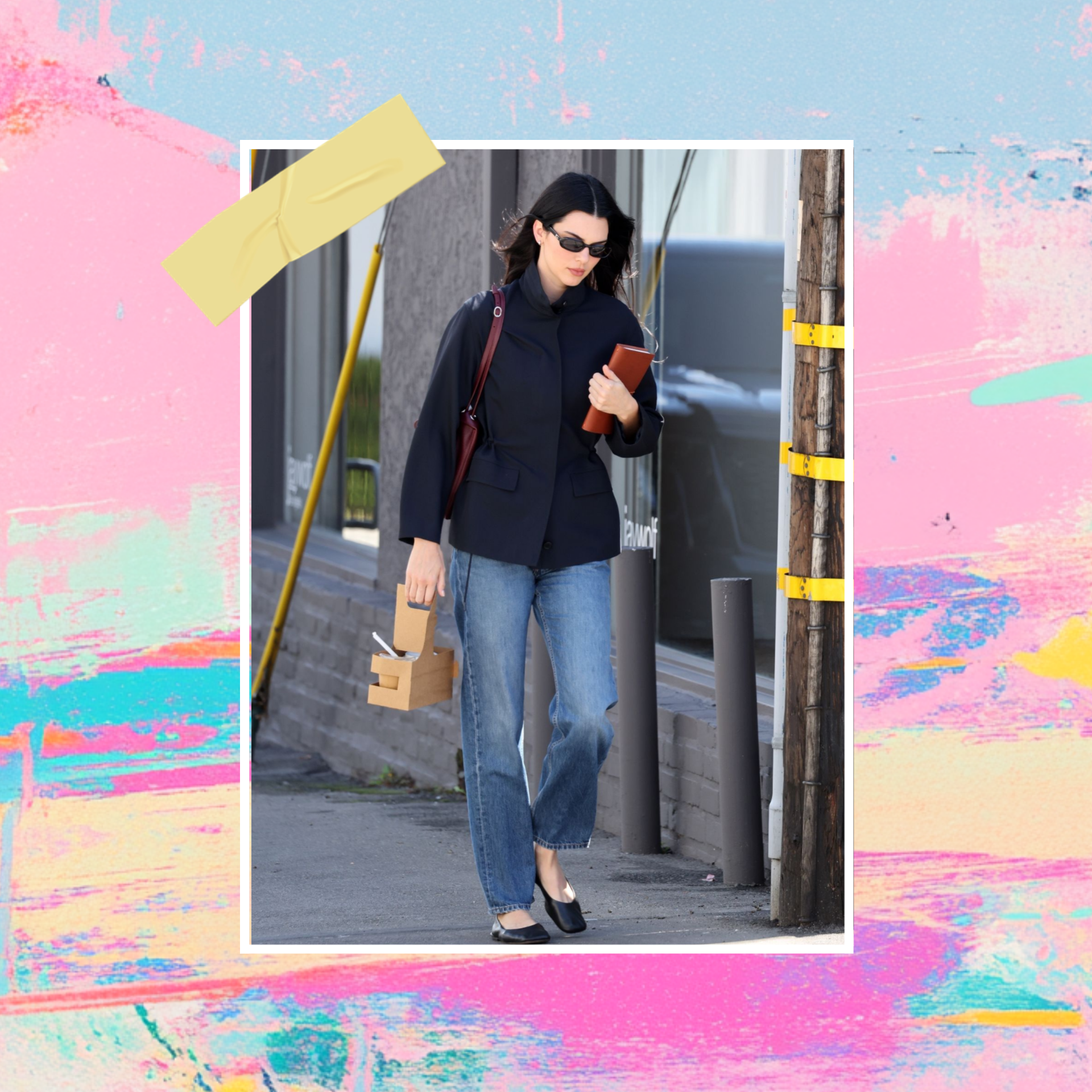 Дженнер подобрала к ней прямые, чуть укороченные голубые джинсы. И тут кроется вторая важная фишка: короткая длина брюк открывает щиколотку — самую тонкую часть ноги, — и в тандеме с лаконичными балетками с квадратным мыском из черной кожи это создает невероятно изящный эффект. Если к таким джинсам и куртке надеть сапоги, согласись, все выглядело бы куда обычнее и даже тяжеловесно. Но прием с балетками и короткой, приталенной за счет кулиски курткой сработал идеально 😍