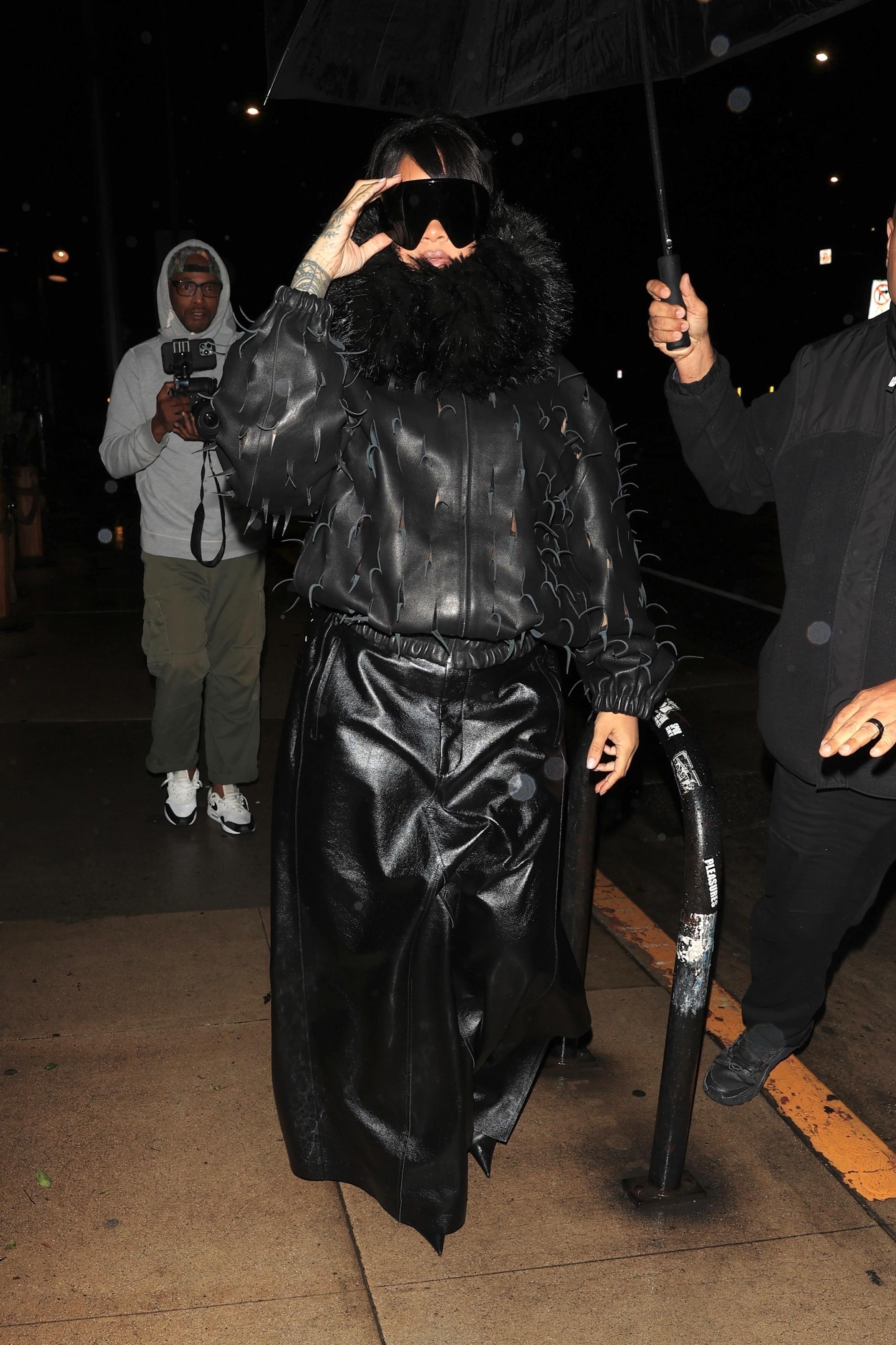 Свой образ певица дополнила длинной юбкой из гладкой кожи с высоким разрезом, который открывал еще один слой кожи — игра текстур в лучших традициях ее узнаваемого стиля. Финальный штрих — остроносые туфли и огромные солнцезащитные очки-маска от Balenciaga, добавляющие еще больше дерзости и эффектности.