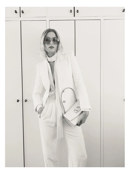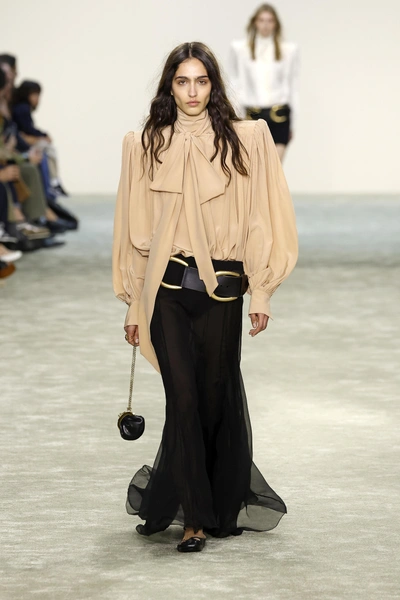 Пожалуй, самое завораживающее воплощение можно увидеть у Chloé. Креативный директор Чемена Камали создала мягкий, поэтичный образ: свободная кремовая блузка с четкими плечами, епископскими рукавами и крупным струящимся бантом сочетается с длинной черной юбкой с заниженной талией. Дополнительный акцент на бедрах — ремень с массивными золотыми пряжками, а в руке для контраста — миниатюрная сумочка на цепочке ✨