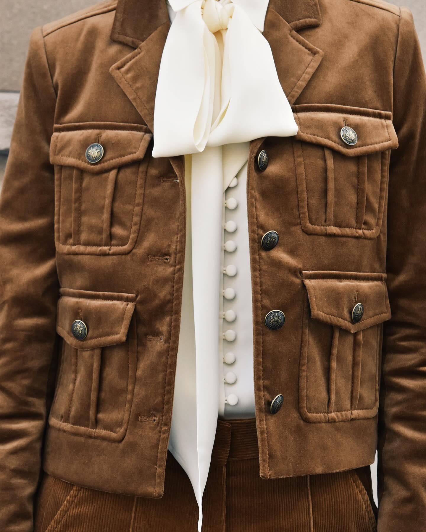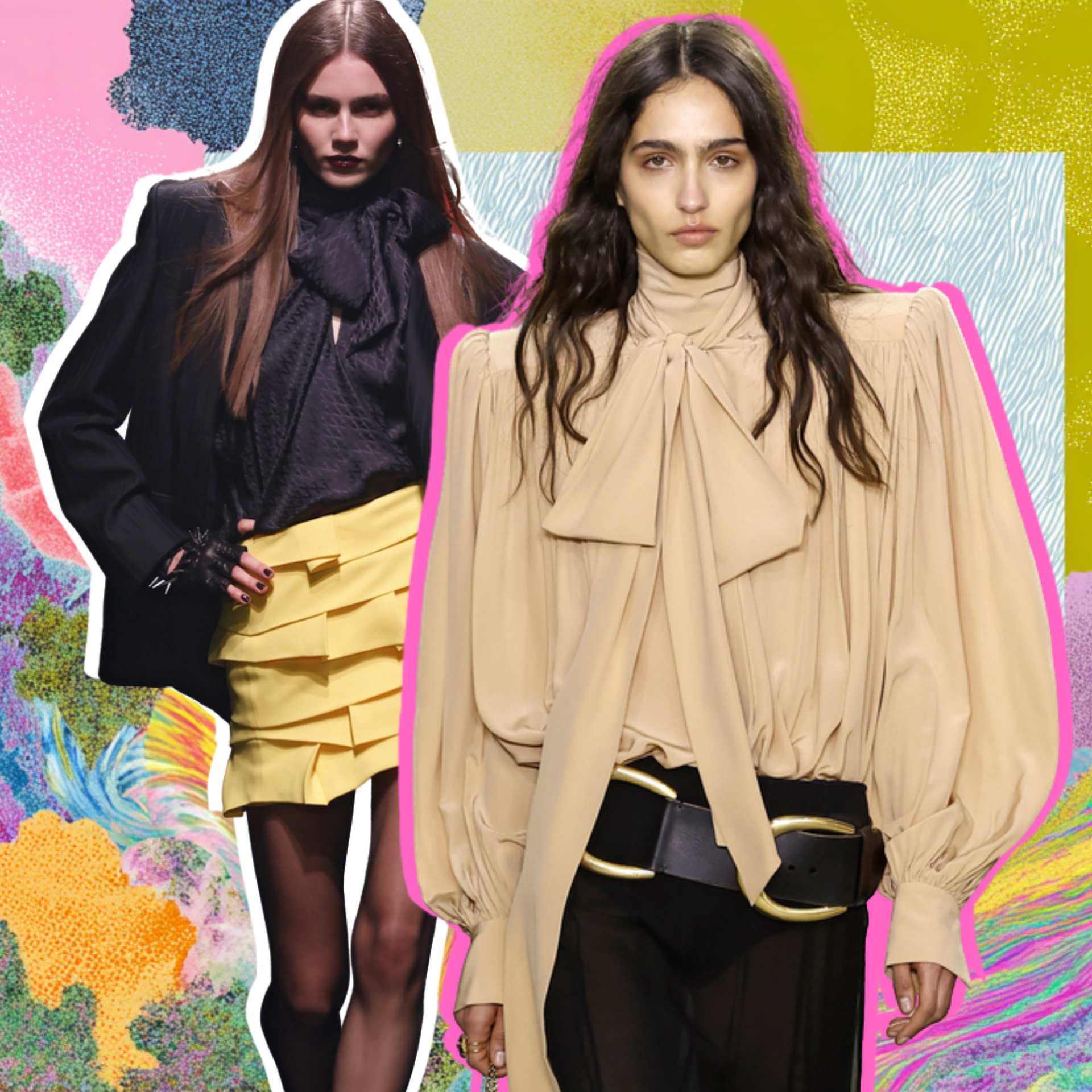 В 1970-х блузки с бантом стали знаковыми для Ива Сен-Лорана — они идеально сочетали силу и нежность. В них выходили на подиум Катрин Денёв и Амалия Вайрелли, а сегодня воротник лавальер вновь занимает почетное место в коллекциях сезона зима 2025/26.