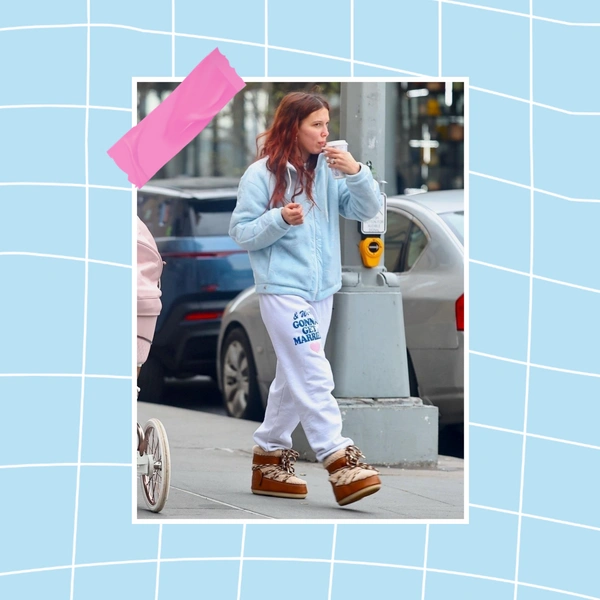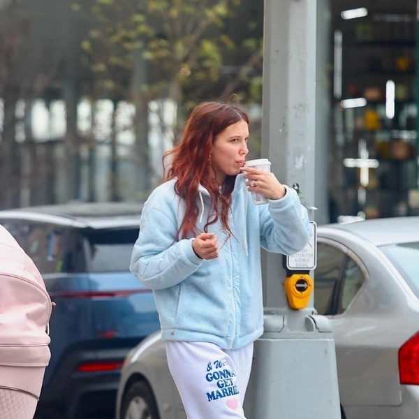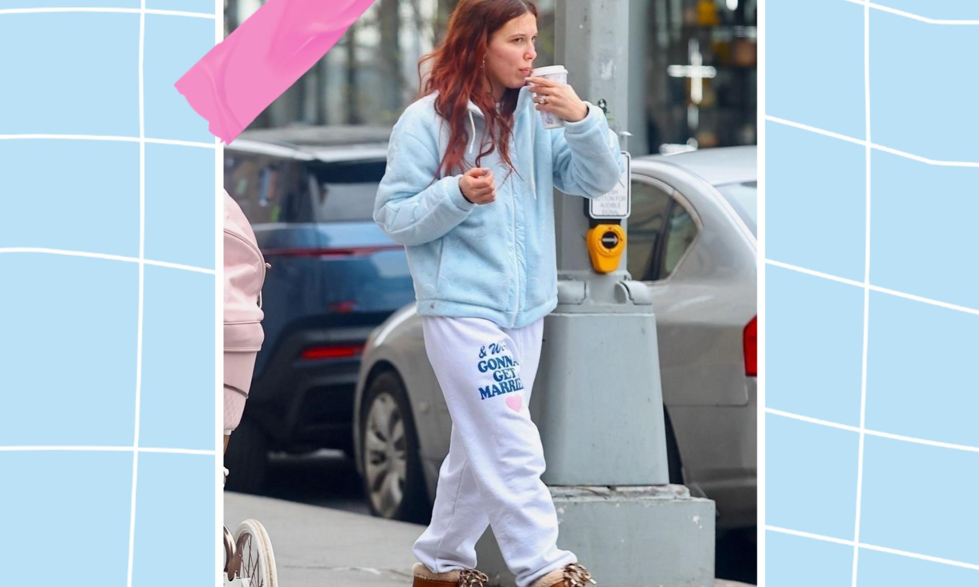 Остальная часть наряда актрисы поддерживала это настроение. В качестве дополнительного теплого слоя Милли надела нежно-голубю флисовую куртку на молнии — практичную и универсальную вещь для зимы. Контрастом к ней стали светлые серые спортивные штаны с дерзкой надписью на одной из штанин: «& мы собираемся пожениться», дополненной розовым сердцем внизу.
