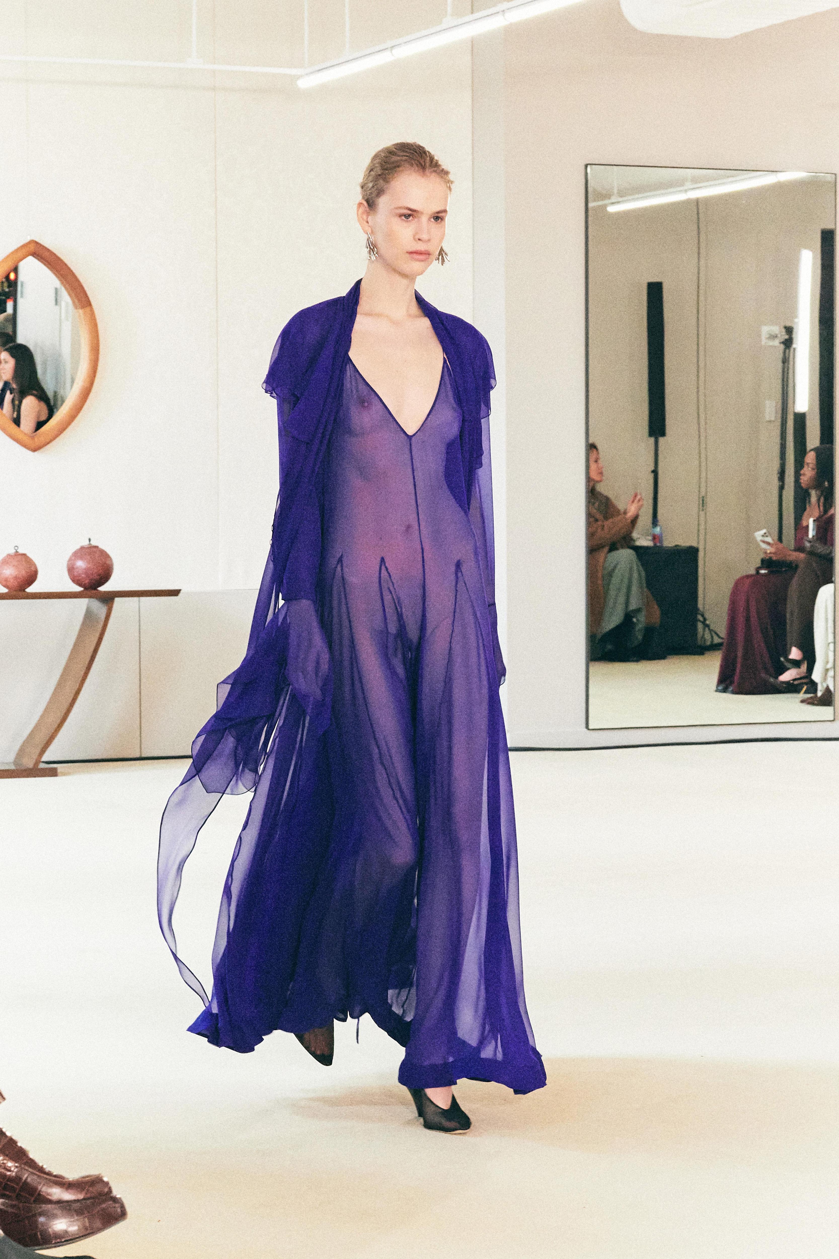 Джозеф Альтузарра в Altuzarra сделал ставку на воздушные, прямо-таки магические платья приглушенного фиолетового оттенка, в которых можно представить себе каких-нибудь волшебниц. А у молодого дизайнера Коллин Аллен фиолетовый встречается в неожиданных сочетаниях — с зеленью сельдерея и небесным голубым. Получается смело, живо и очень современно.