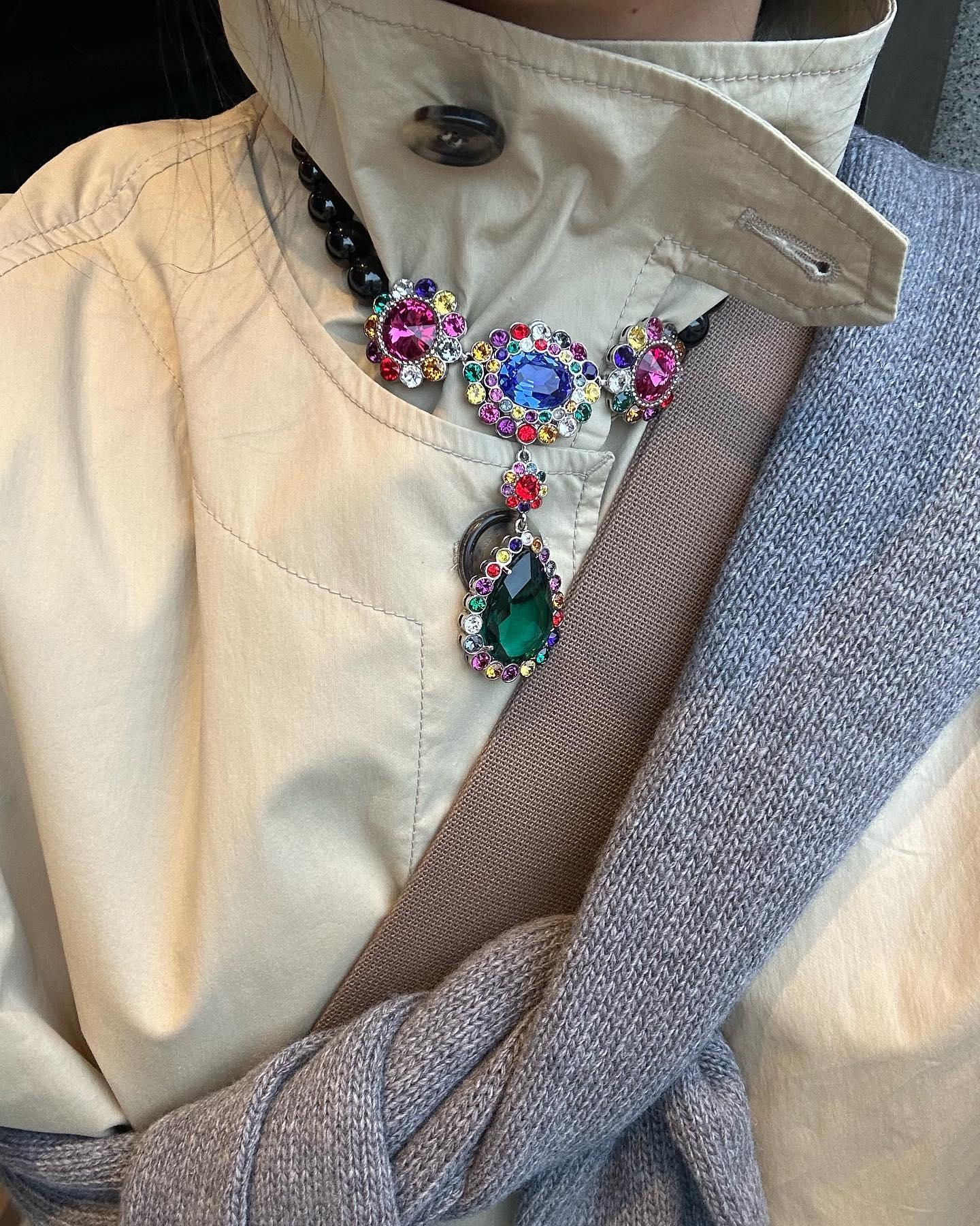 Главный принцип нового сезона — не бояться перебора. Пусть ожерелье лежит поверх шарфа, свисает на плечи или прячется наполовину под лацканы. Главное, чтобы оно выглядело уверенно и придавало образу характер.