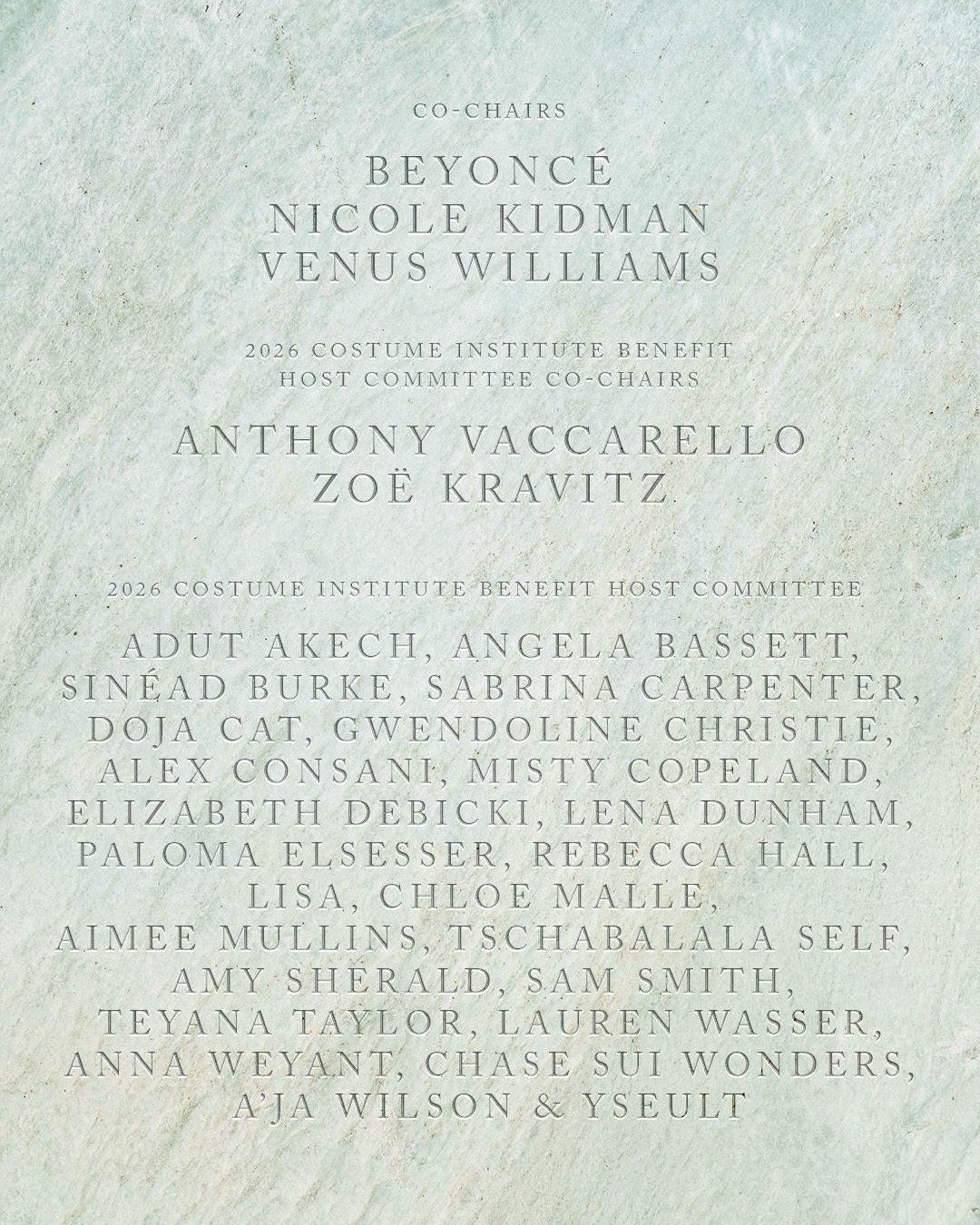 Кого ждать на красной дорожке? Полный список гостей держится в секрете до самого последнего момента, но имена сопредседателей и членов организационного комитета уже известны. В этом году компанию Анне Винтур составят Бейонсе, Николь Кидман и Винус Уильямс. Энтони Ваккарелло и Зои Кравиц также выступают в роли сопредседателей. В оргкомитет вошли Сабрина Карпентер, Доджа Кэт, Гвендолин Кристи, Элизабет Дебики, Лена Данэм, Лиса из BLACKPINK, Сэм Смит и многие другие. Недавно список пополнили Анджела Бассетт, Ребекка Холл, Эйми Маллинс, Чейз Суи Уондерс и другие яркие имена.