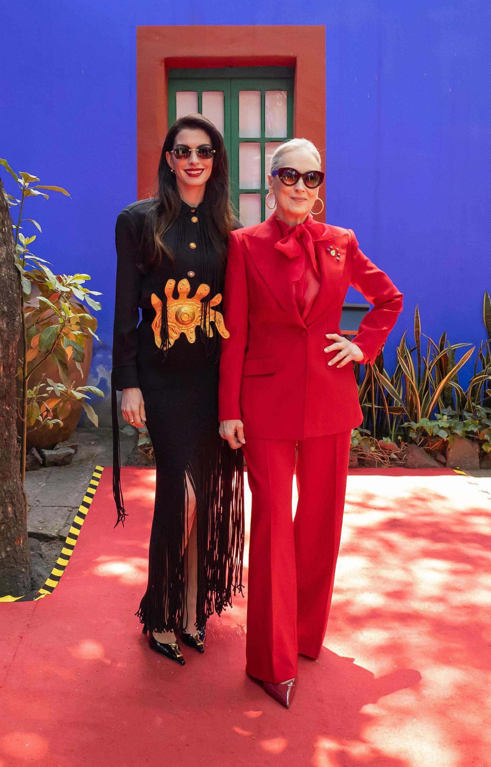 Чуть ранее в тот же день актрисы побывали на пресс-конференцию в Музее Фриды Кало, и там их образы были еще более театральными. Энн Хэтэуэй предстала в фантастическом наряде от Schiaparelli: черное платье с бахромой, широкий сюрреалистичный золотой пояс в виде глаза, туфли-лодочки, солнцезащитные очки и украшения от Bulgari. Образ получился одновременно элегантным и дерзким — идеальное продолжение трансформации Энди Сакс, которую мы помним по первой части.