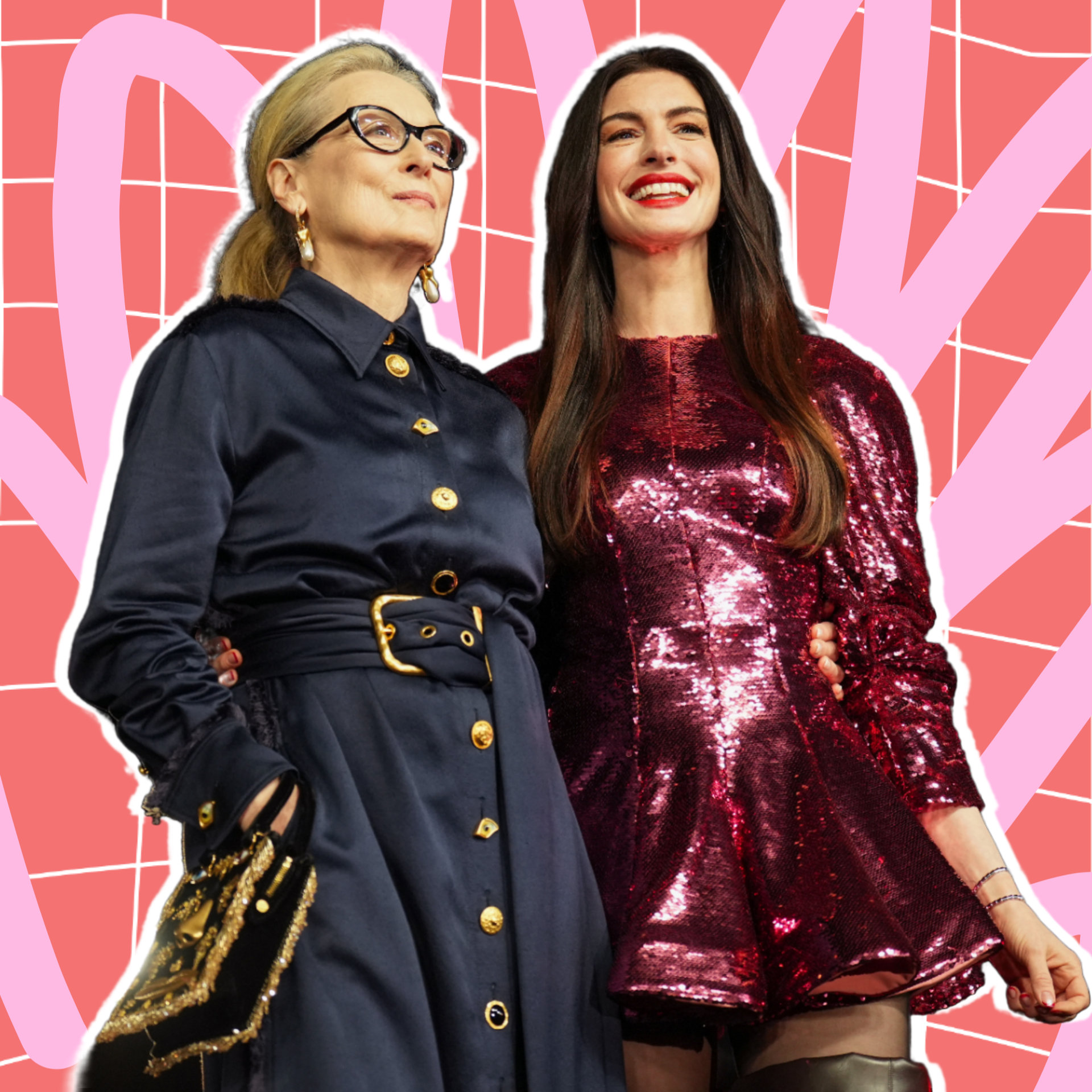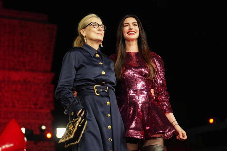 На этой неделе в Мехико стартовала рекламная кампания долгожданного сиквела. Для своего первого появления перед публикой Энн Хэтэуэй и Мерил Стрип выбрали образы, которые сразу же вызвали ностальгию по культовой ленте. Хэтэуэй блистала в насыщенно-розовом платье из коллекции Stella McCartney осень-зима 2026. Наряд с длинными рукавами, круглым вырезом и расклешенной мини-юбкой был полностью расшит пайетками, которые переливались при каждом движении. Широкие плечи добавляли образу графичности, а эффектные складки на юбке — динамики.