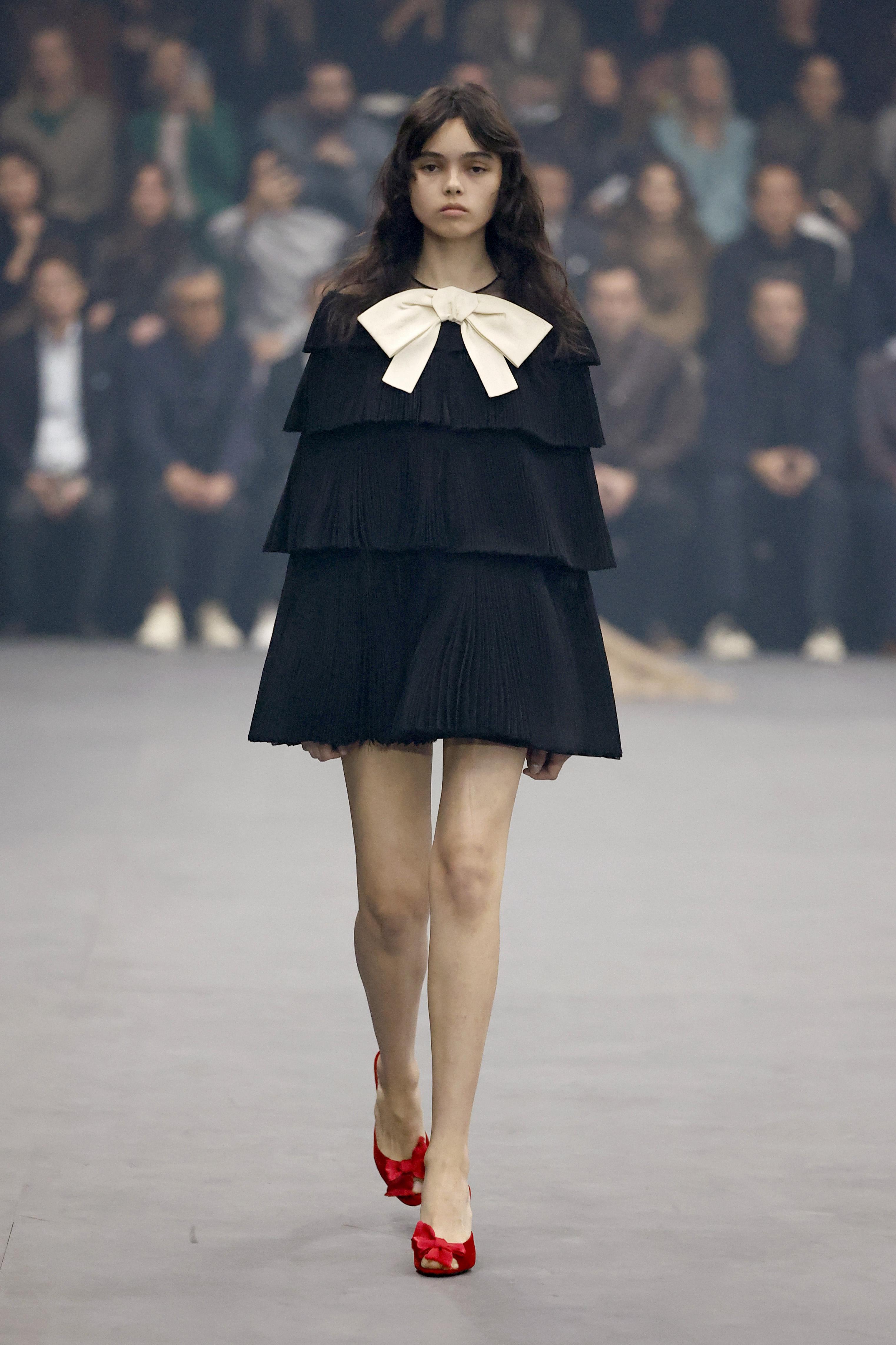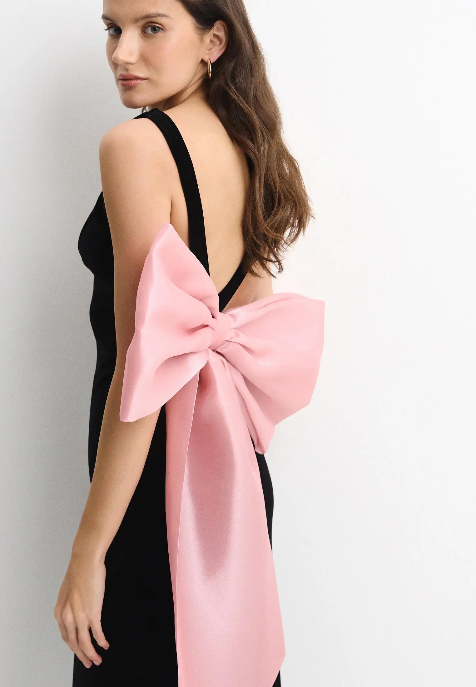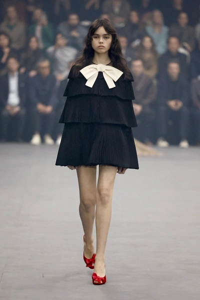 Банты перестали быть исключительно милым декором. В версиях Dior и Valentino они приобрели графичность и объем. Это может быть один крупный бант с неожиданным вырезом или несколько маленьких, выстроенных вдоль силуэта. Особенно эффектно такие платья смотрятся в контрастной гамме или в идеально выверенных однотонных вариантах. Бант в этом сезоне — не про инфантильность, а про форму и акцент.