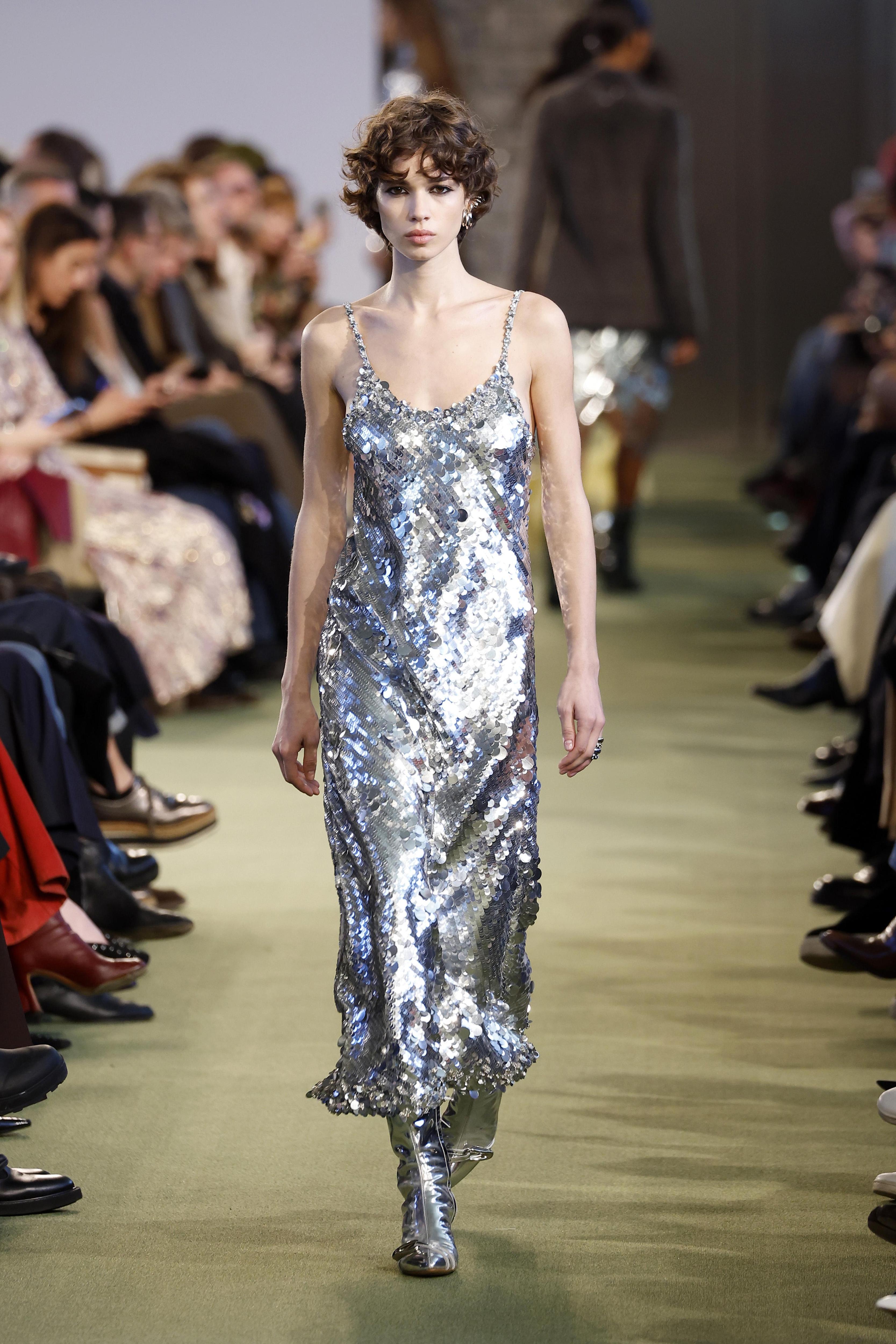 Серебро — один из ключевых оттенков для праздников 2026 года. В коллекциях Courrèges и Rabanne оно звучит футуристично и чисто. Это могут быть платья с металлическим блеском, вставками, пайетками или гладкой зеркальной текстурой. Силуэт — четкий, лаконичный, без лишних деталей. Такое платье само по себе становится главным элементом образа.