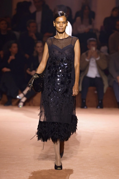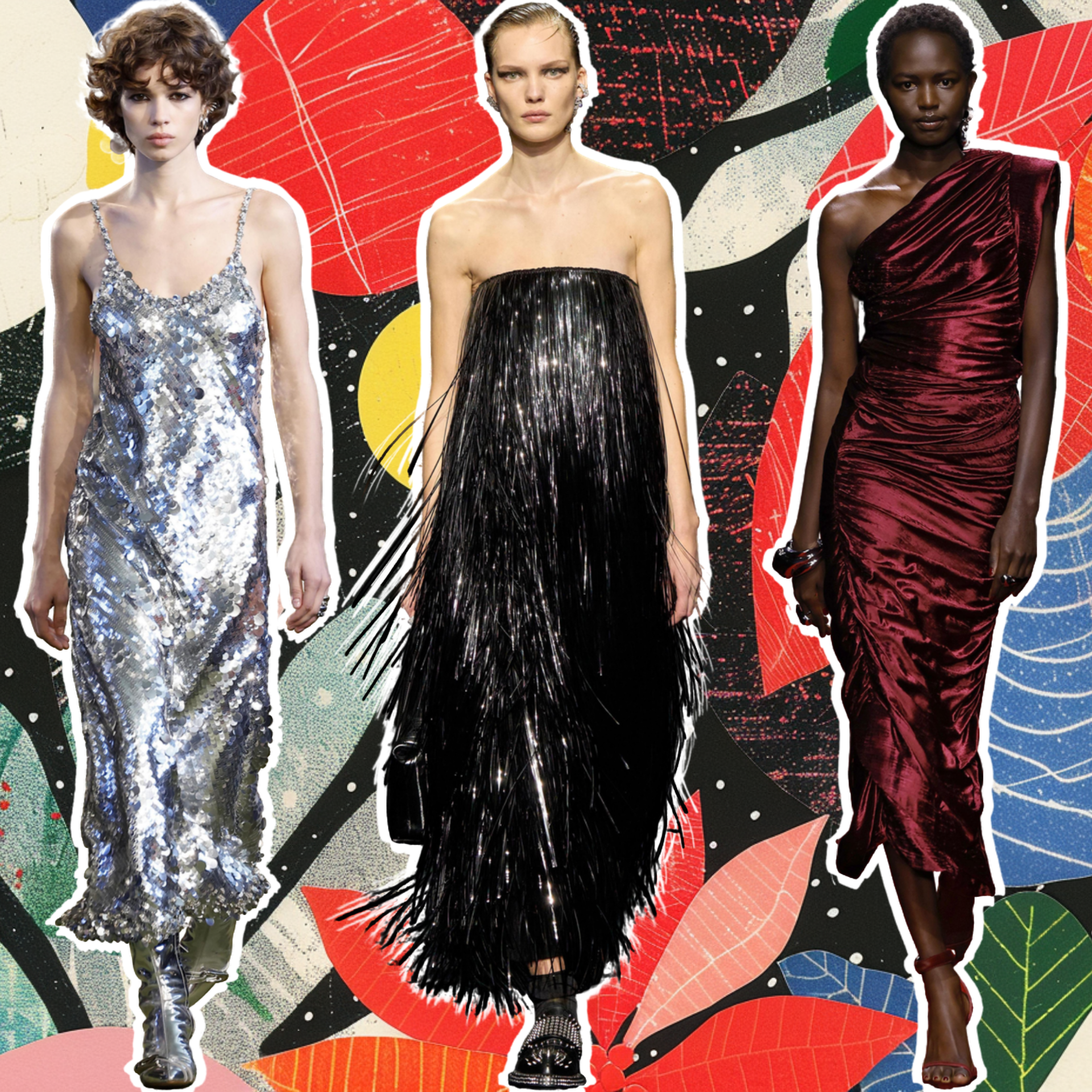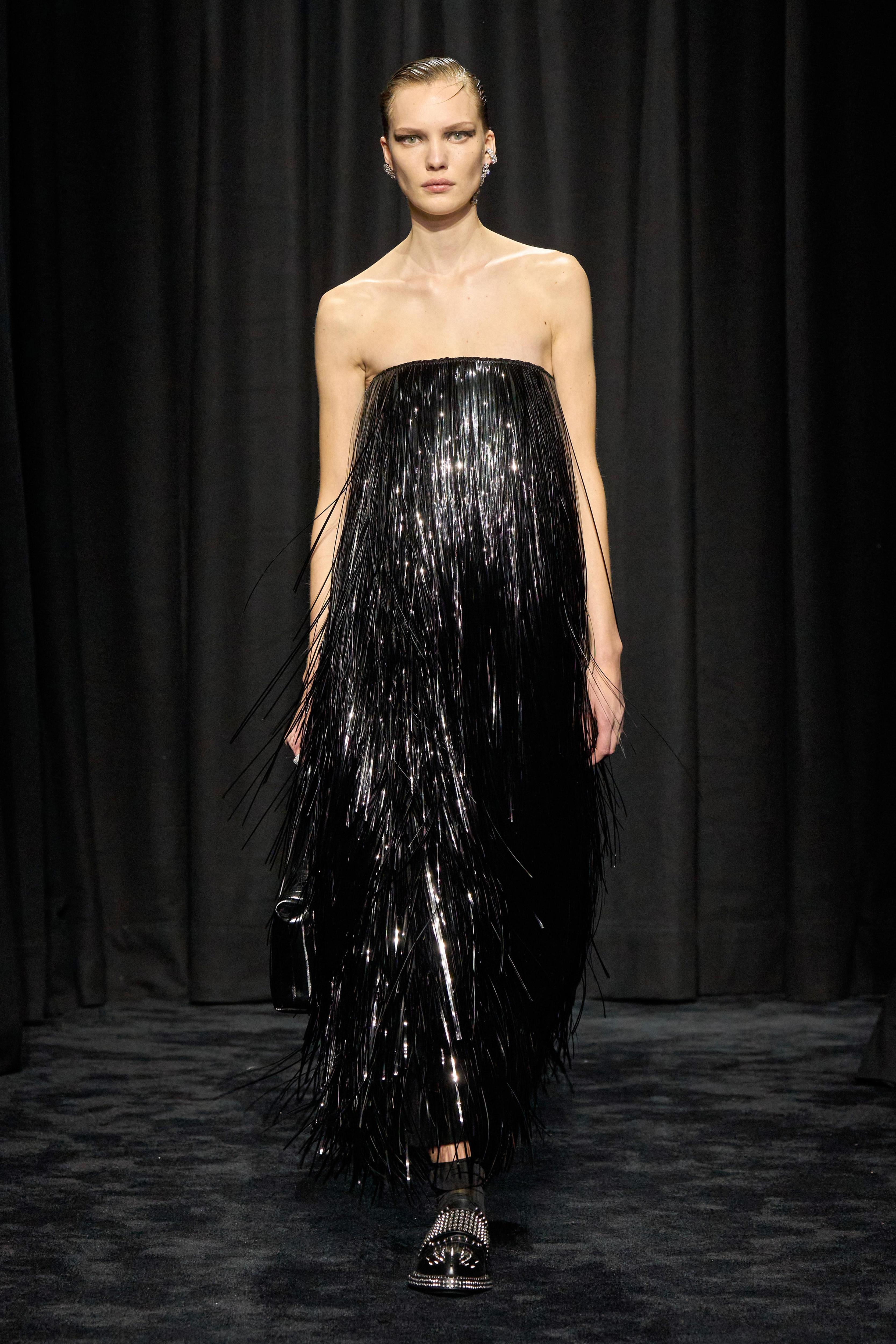 Забудь про ассоциации с вестернами — актуальная бахрома совсем другая. Как у Jil Sander, она работает на движение и свет. Лучше всего выбирать черные, серебристые или блестящие модели, где тонкая бахрома мягко колышется при каждом шаге. Особенно удачно такие платья смотрятся в танце и при вечернем освещении — идеальный вариант для активной новогодней ночи.