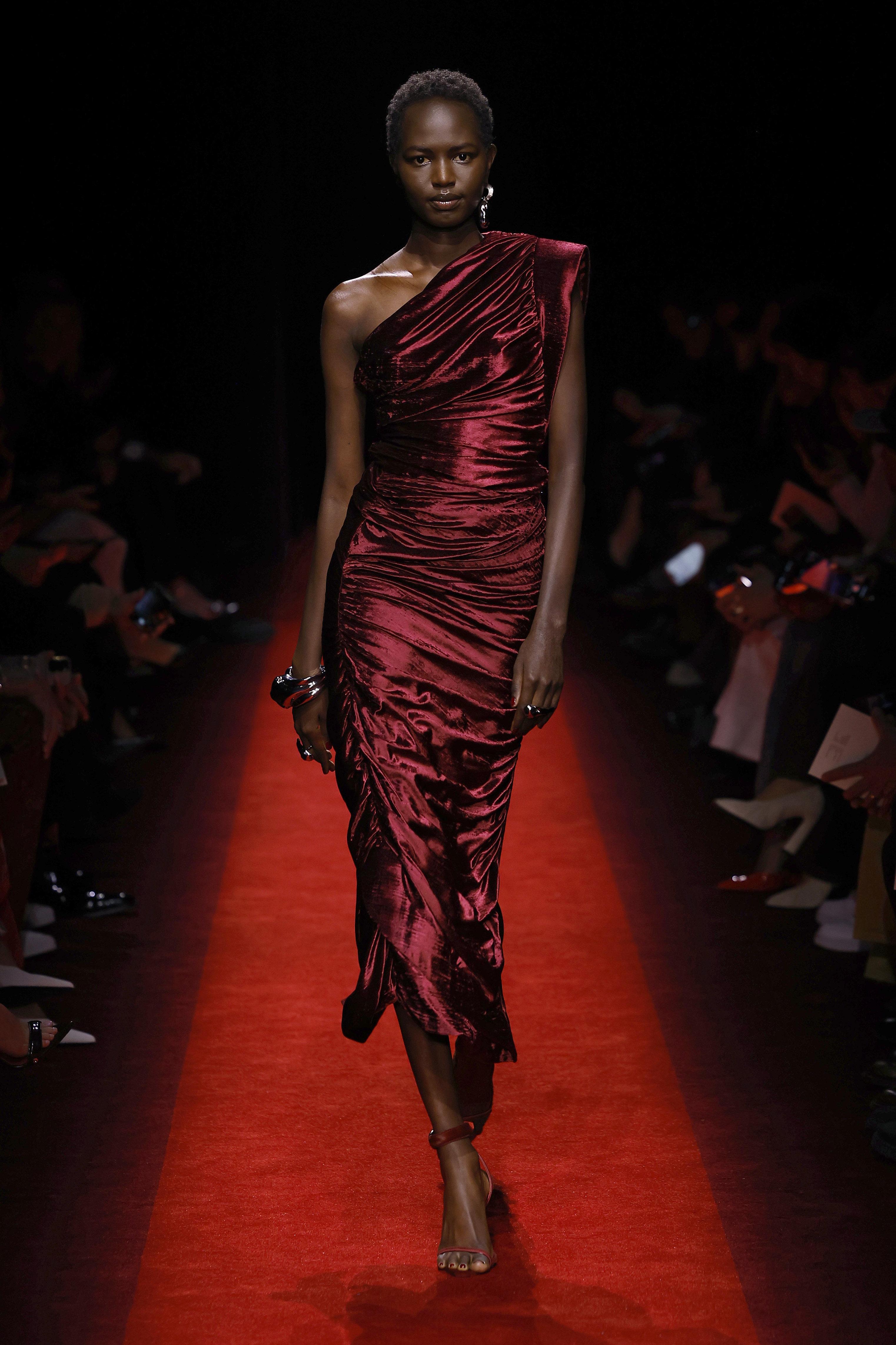 Асимметрия уверенно удерживает позиции, особенно в вечерних образах. Бордовое платье с металлическим отливом, как у Ferrari, — настоящая находка для Нового года. Оно выглядит торжественно, но не требует сложной стилизации. Достаточно лаконичных туфель и минимальных украшений, чтобы образ выглядел цельным и продуманным.