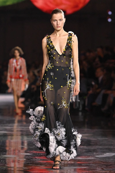 Цветы зимой звучат особенно эффектно — именно на этом контрасте и строится тренд. В дебютной коллекции Мэтью Блази для Chanel цветочные мотивы выглядели почти кутюрно. Для новогодней ночи подойдут платья с объемной вышивкой, бисером, аппликациями или прозрачной основой. Романтичный принт здесь работает в паре с легкой откровенностью, создавая образ, который выглядит нежно и при этом вполне взрослым.