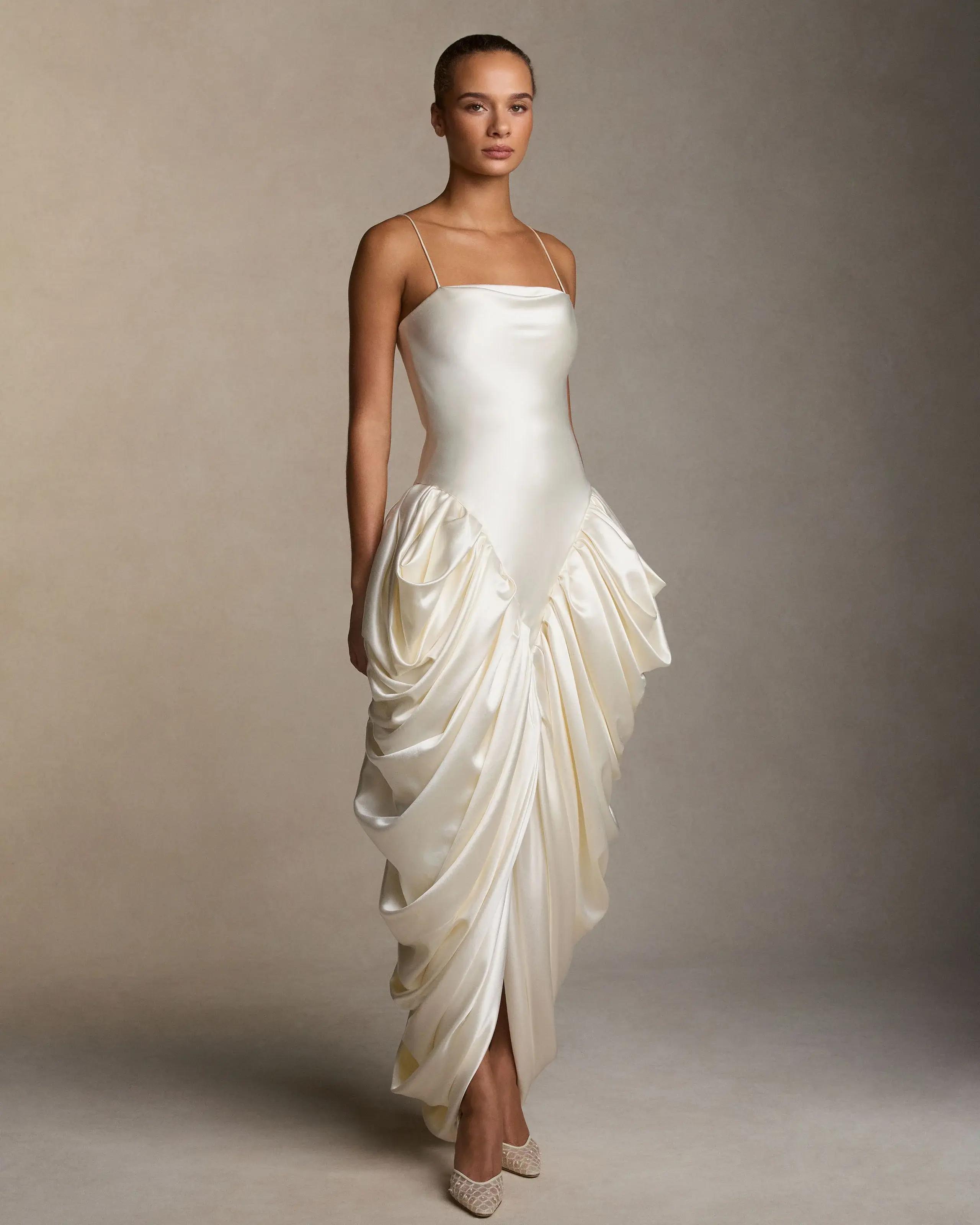 Вдохновившись той самой тихой и сдержанной романтикой платья-комбинации, дизайнеры тут же перенесли ее в свои новые коллекции. Monique Lhuillier, Kyha, Savannah Miller — лишь несколько имен среди тех, кто сделал ставку на лаконичный атлас без обилия декора. Высокие воротники, глубокие вырезы, открытые плечи — детали варьируются, но суть неизменна: чистый силуэт, струящийся до пола, и очарование едва мерцающего атласа и шелка.