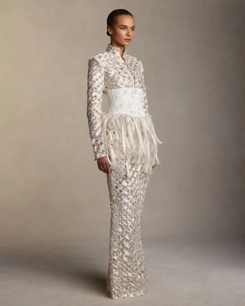 Сами дизайнеры тем временем подняли мастерство на недосягаемую прежде высоту, сосредоточившись не только на тканях высочайшего качества, но и на мельчайших, почти ювелирных деталях. Бренд House of Gilles подчеркнул свою приверженность ремеслу, заявив в пресс-релизе: «В высокой моде мы доводим мастерство до бескомпромиссного уровня — в нашей работе есть точность и глубина, присущие только нам». И это не пустые слова: на подиуме были продемонстрированы прозрачные накидки с перьями ручной работы, бюстье из органзы, на создание которого ушло более двухсот часов, и фата с эффектом «песчаной» ткани, украшенная каскадом воздушных рюшей.